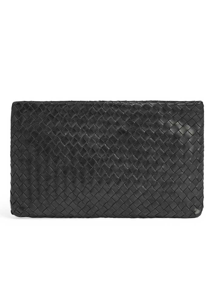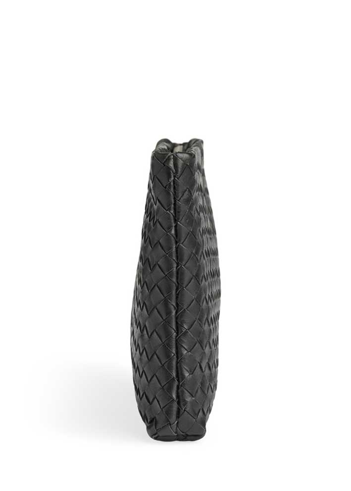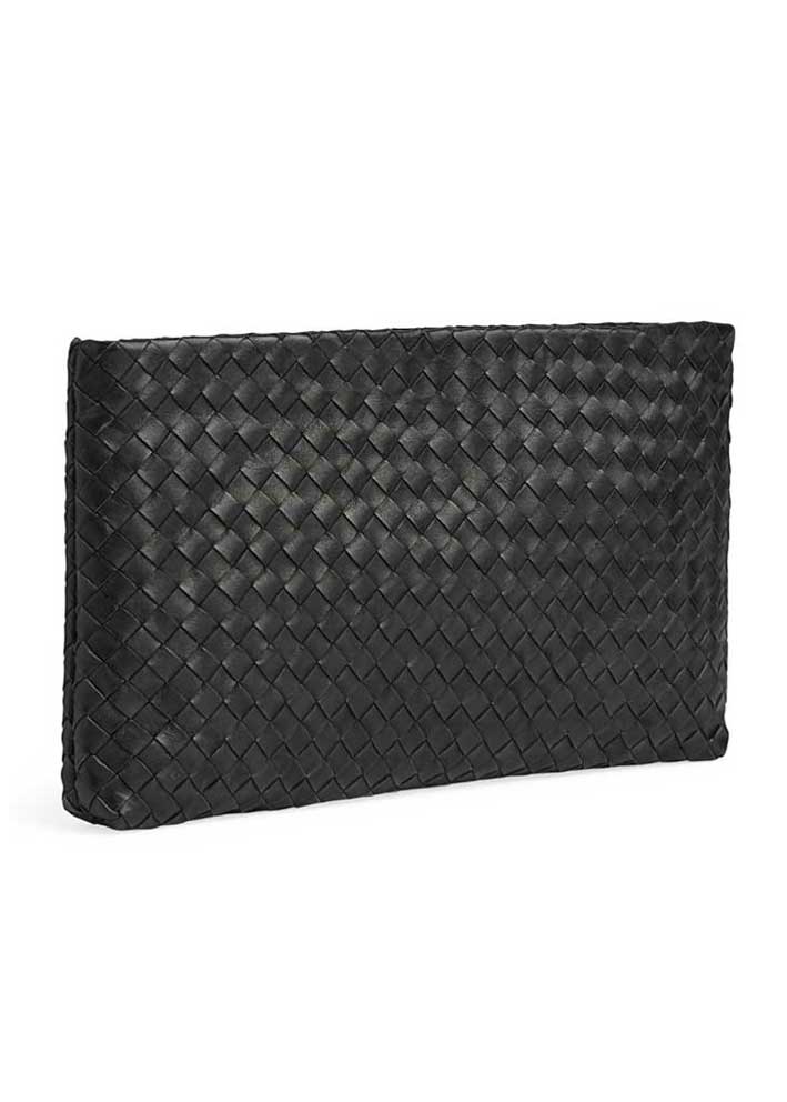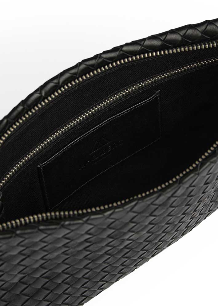 Smuk håndflettet sort Ila clutch taske fra Markberg, designet i kalveskind og foret med bomuld. Clutchen har en god størrelse, et eksklusivt look og rummer alt det du har brug for at have ved hånden.