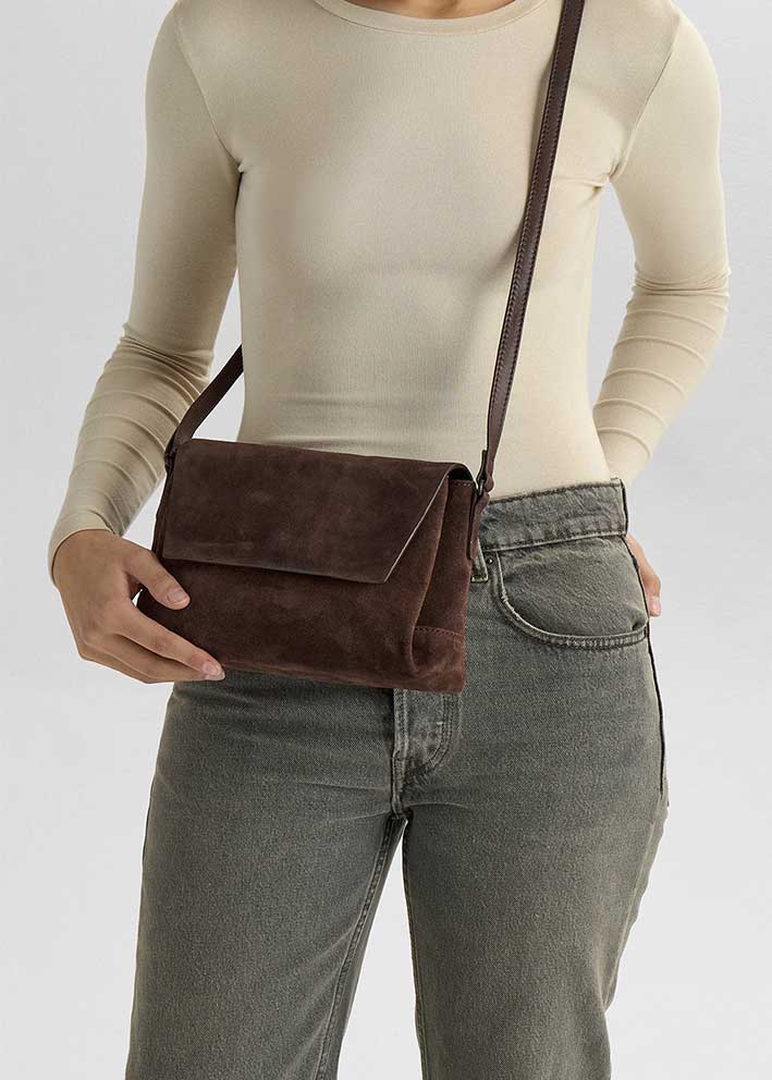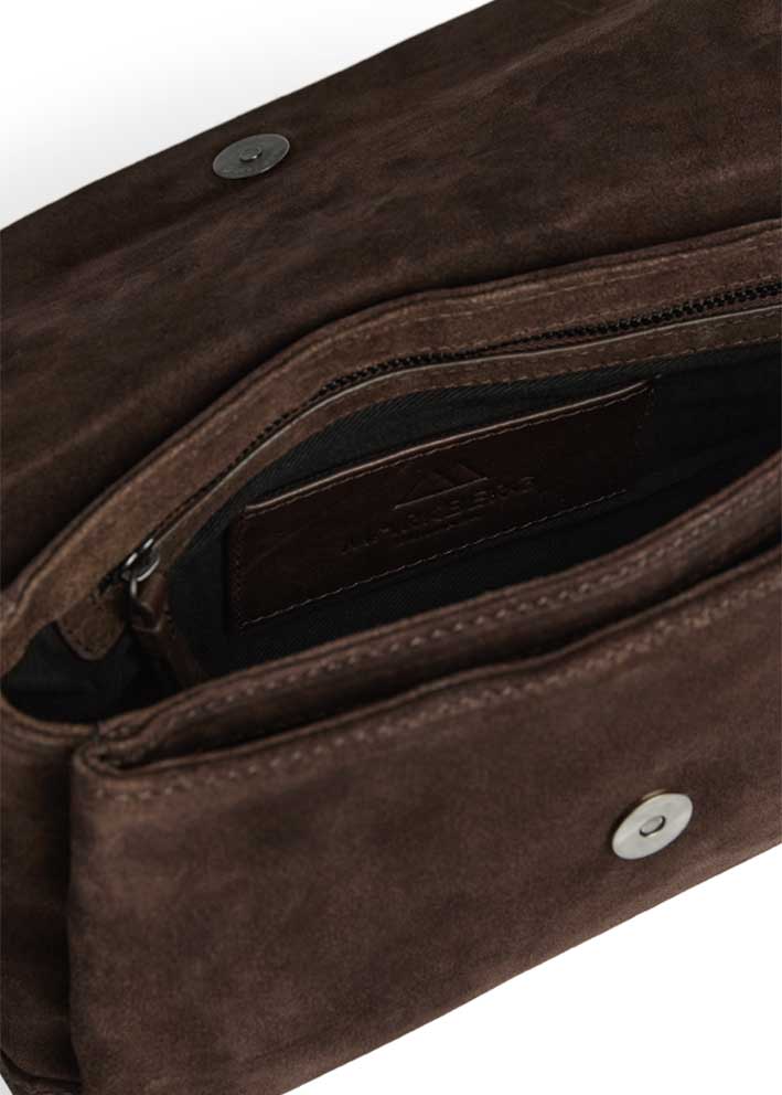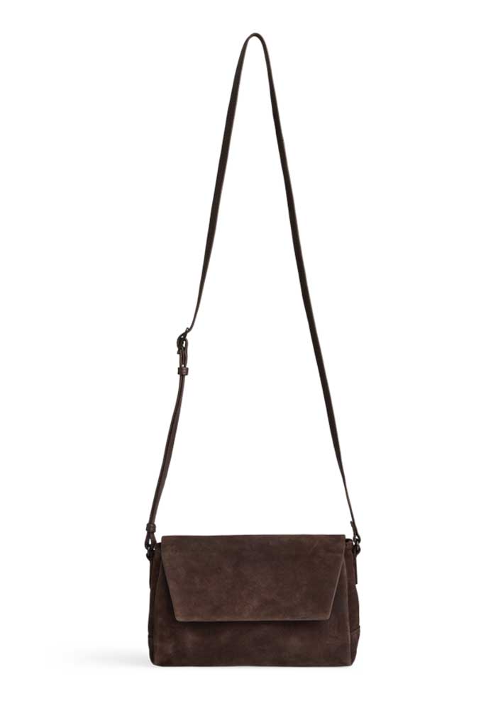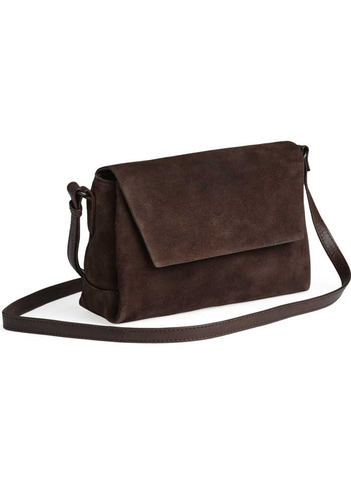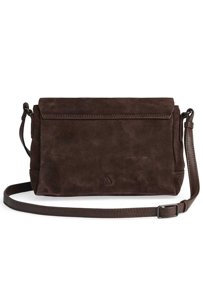 Smuk, elegant og tidløs Jules crossbody taske fra Markberg, desginet i eksklusivt mørkebrunt ruskind, der gør den nem at style til både hverdag og aften.