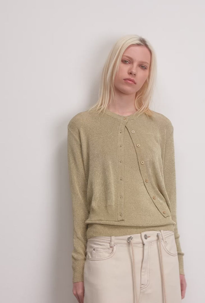 Smuk guldglimmer Parli cardigan fra Munte, designet med en elegant rib afslutning. Denne cardigan har lange ærmer og er designet til et kropsnært fit.