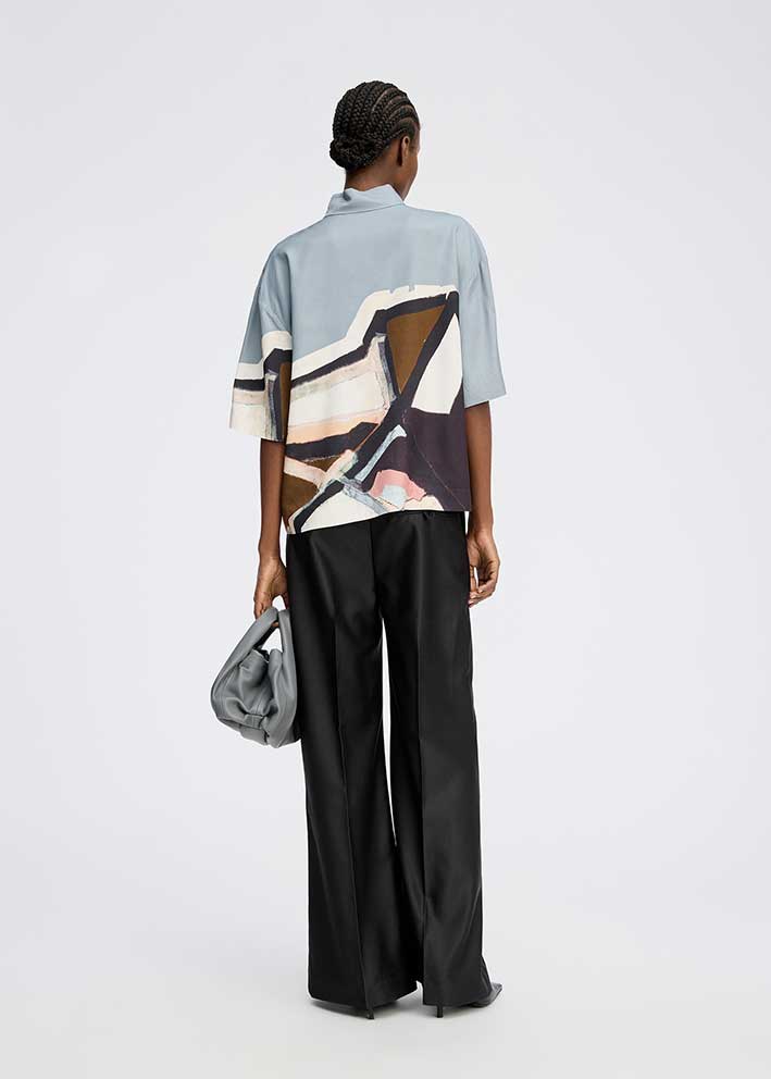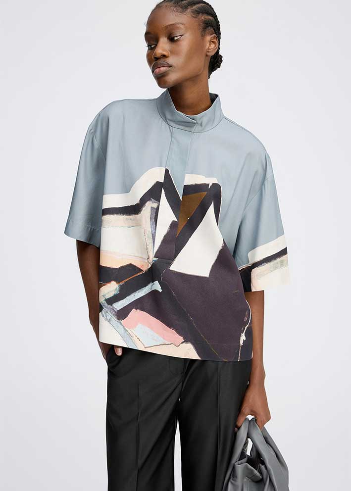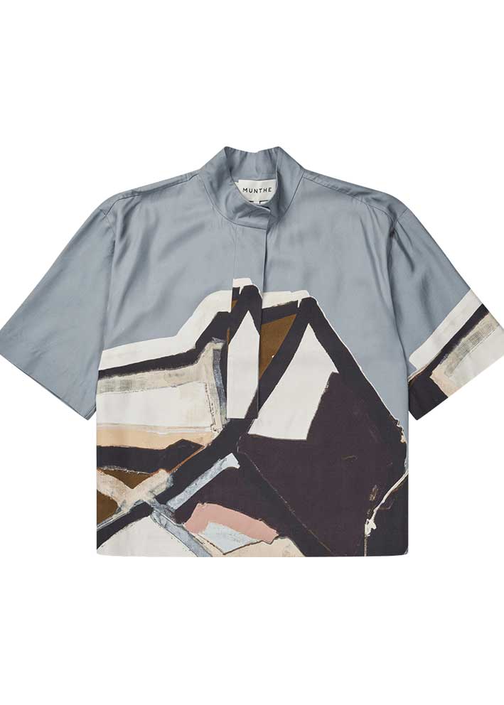 Smuk Roger skjortebluse fra Munthe, designet med et elegant grafisk kunstprint. Skjorten har et løst snit, korte ærmer, kan åbnes halvvejs ned og har en lille krave med en fin knaplukningsdetalje.