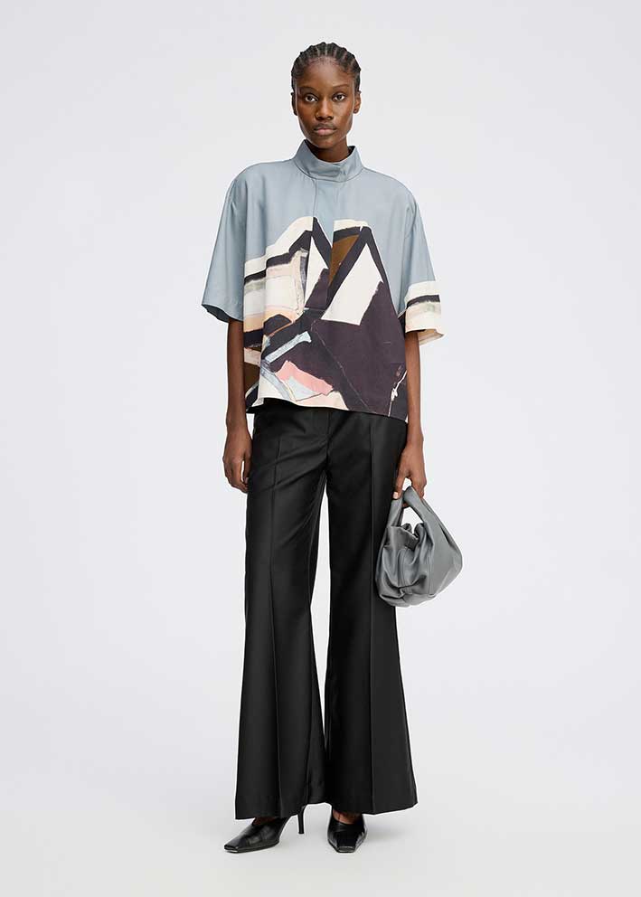 Alsidig skjorte, der er flot både til bukser og nederdel. Her vist med klassiske sorte bukser og matchende nederdel.
