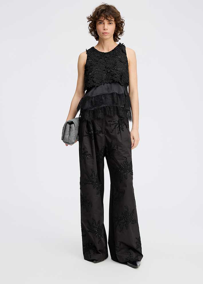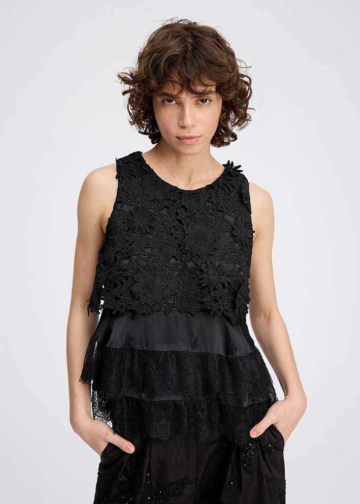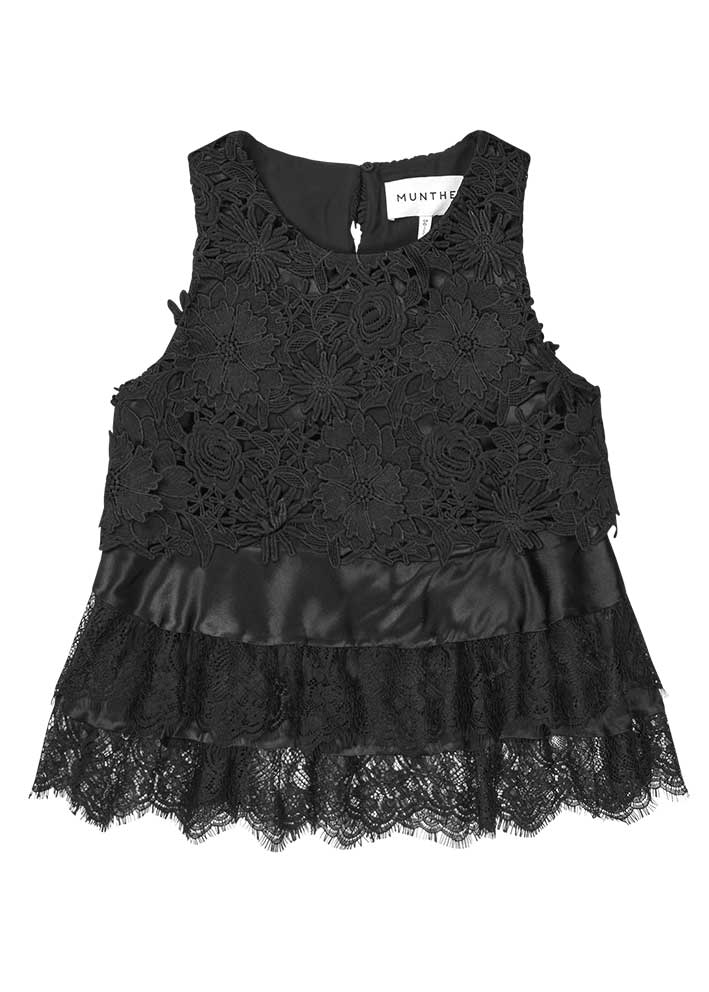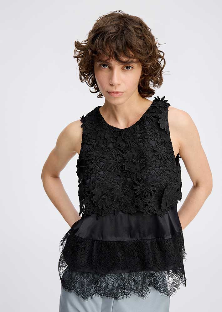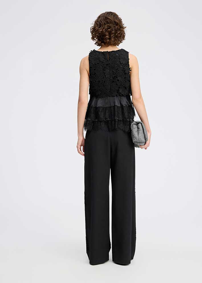 Meget smuk, feminin og elegant sort Rachine blondetop fra Munthe, designet med smukke blomsterbroderier og flæsekant i blonder. Toppen har rund halsudskæring og lukning i nakken.