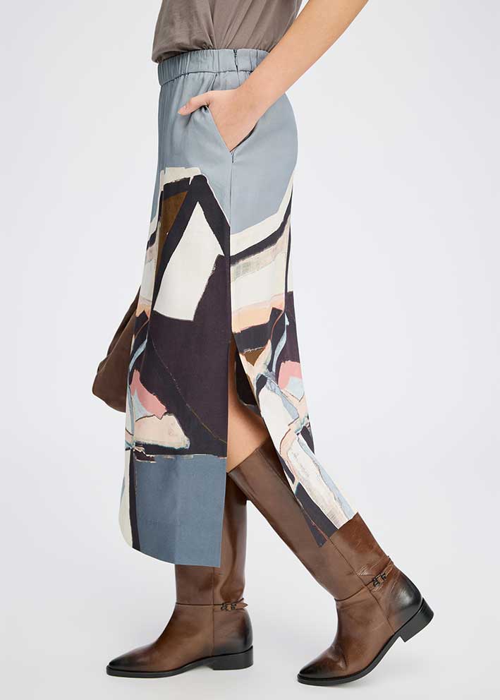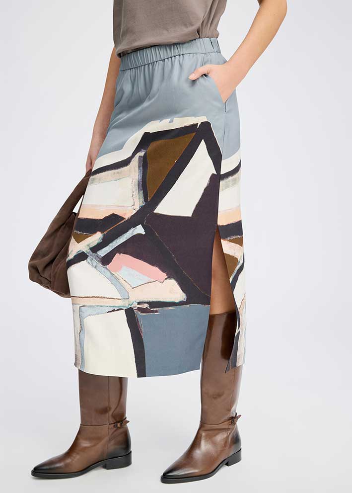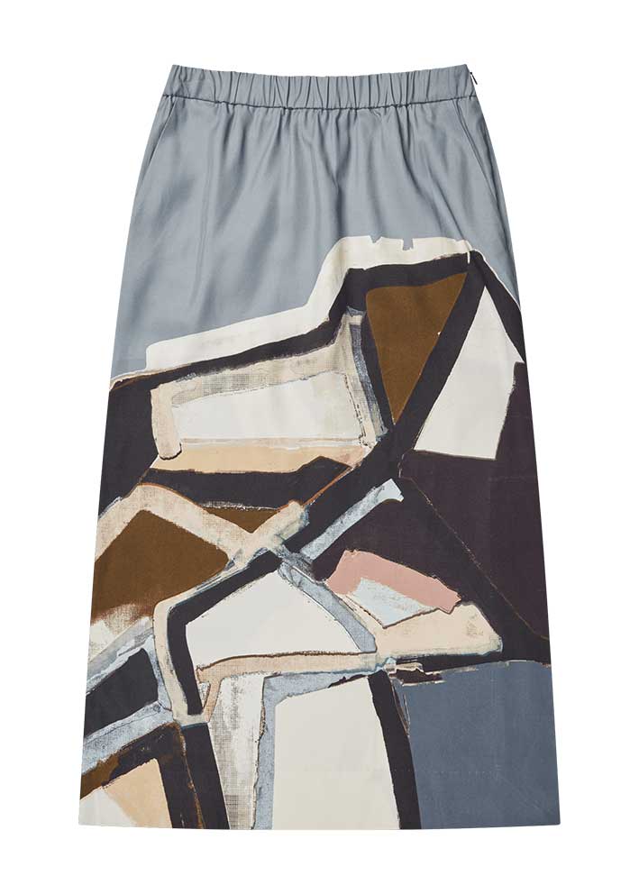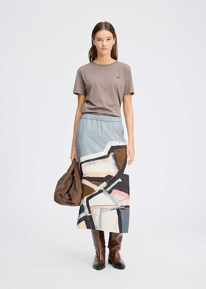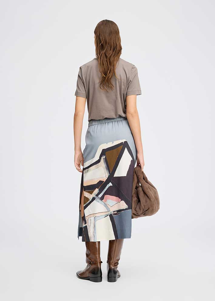 Smuk Rocky nederdel fra Munthe, designet med et elegant abstrakt grafisk print i smukke brund, grå, creme og rosa nuancer. Nederdelen er designet med en elastisk talje, slids og lommer i siden.
