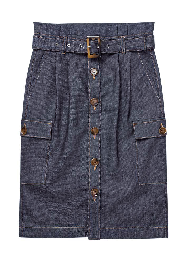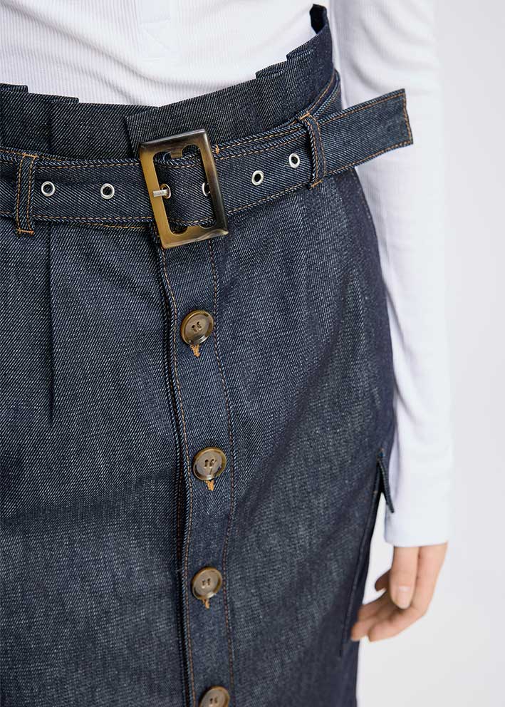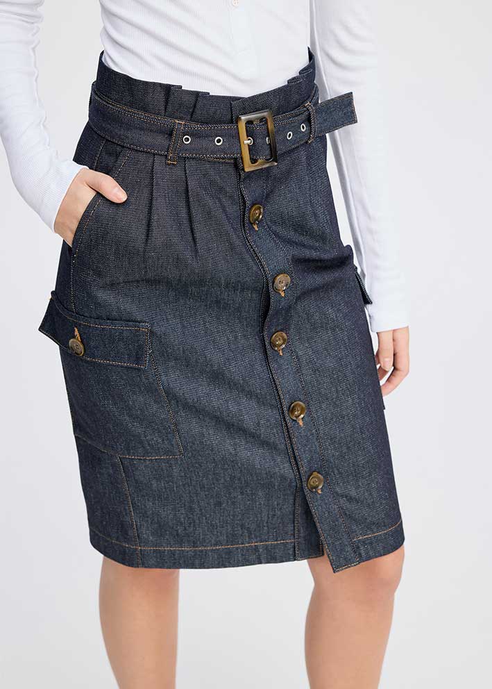Super cool og elegant højtaljet Raina denimnederdel fra Munthe, designet med knaplukning foran, aftageligt stofbælte og statement lommer med klap i siden.