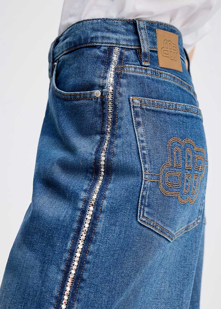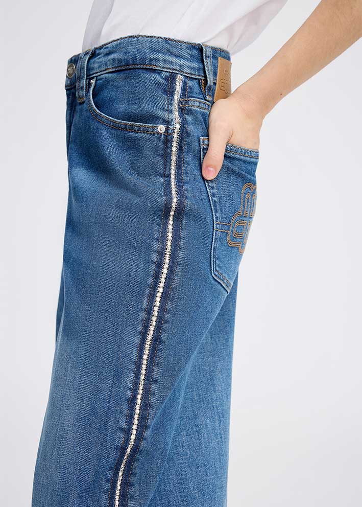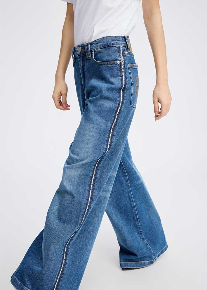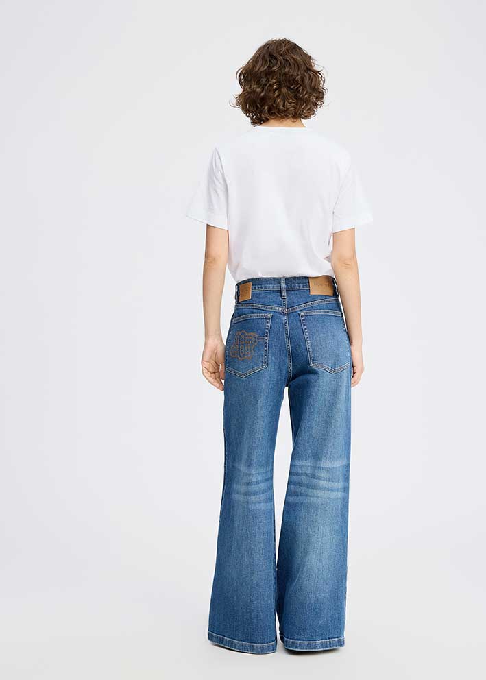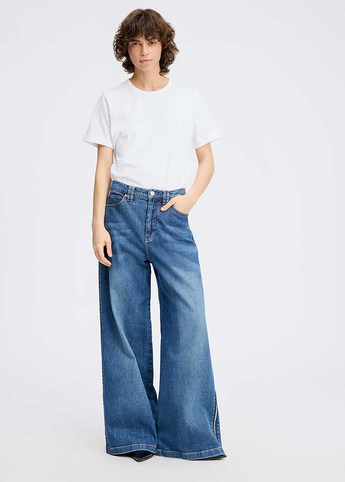 Jeans next level ♥ Super lækre og elegante brede Rewari jeans fra Munthe, designet med en smuk simili kontrastsyning langs sidesømmen. Disse jeans har en broderet MUNTHE-emblem detalje på baglommen, bæltestropper og lukkes med lynlås og knap.