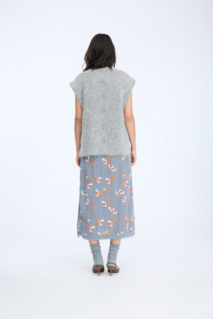 Elegant og lun oversized grå Rydine strikvest fra Munthe, strikket i blød og let tekstur. Vesten har V-udskæring foran og dekorative knapper langs ryggen, der giver et smukt twist. Perfekt til lag-på-lag-styling over skjorter eller kjoler.