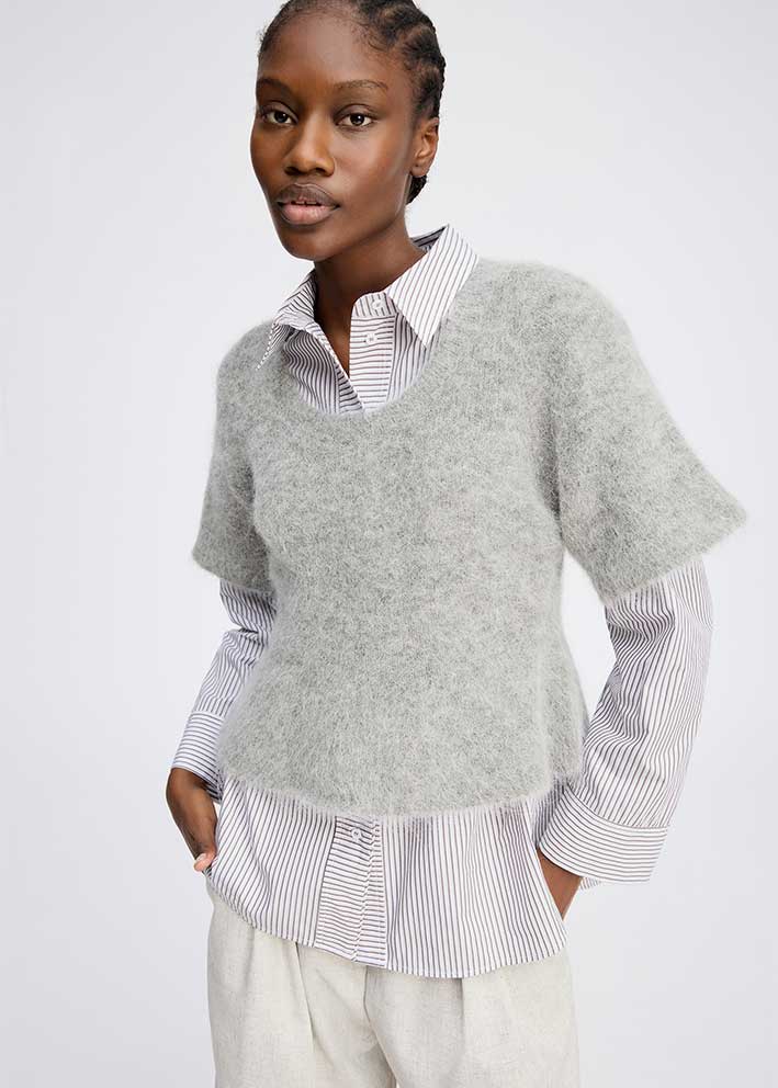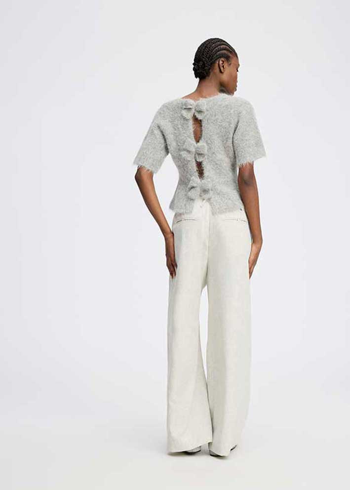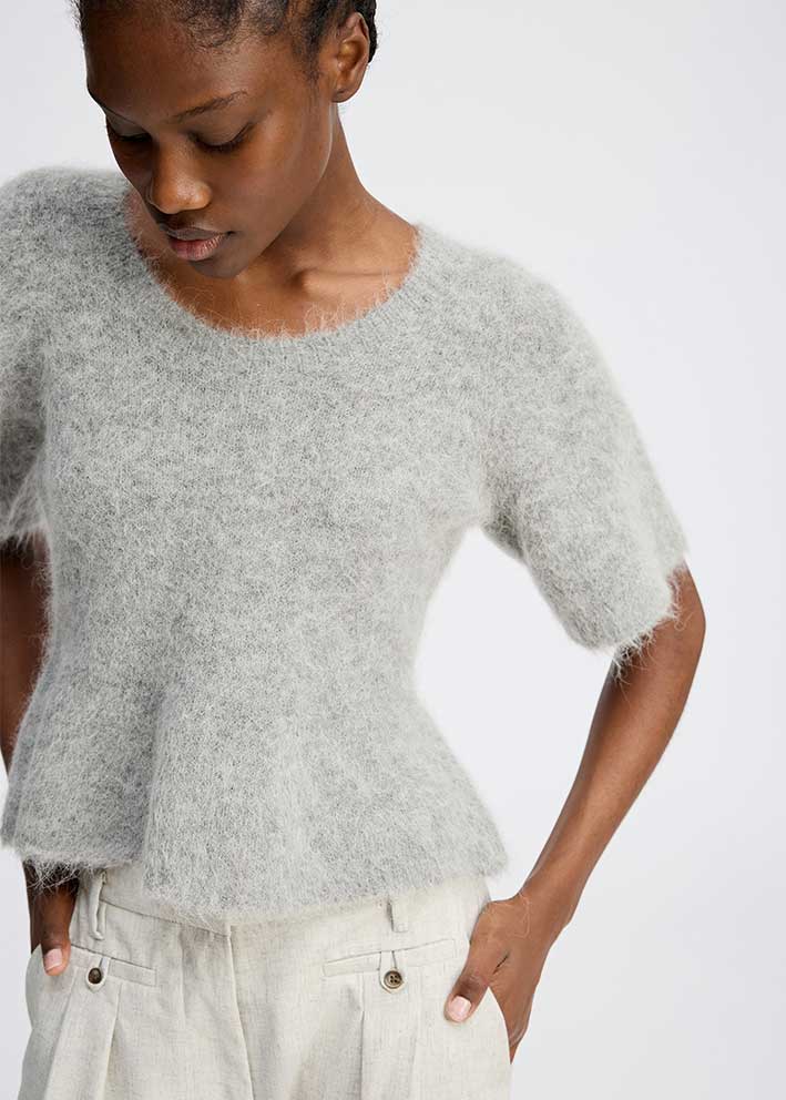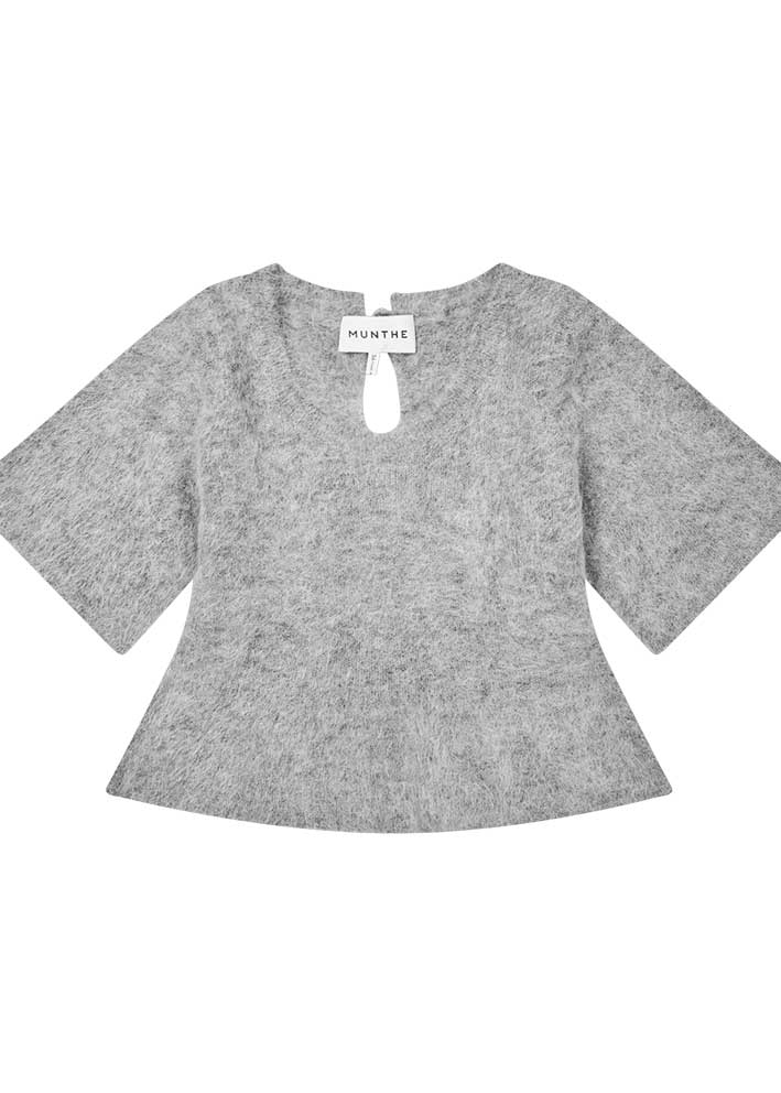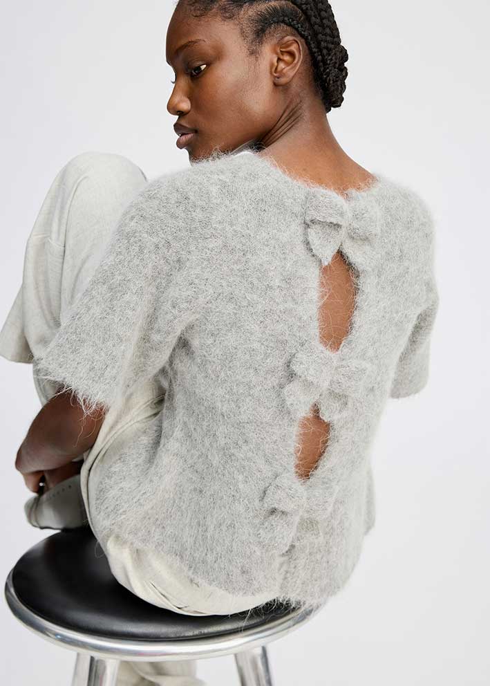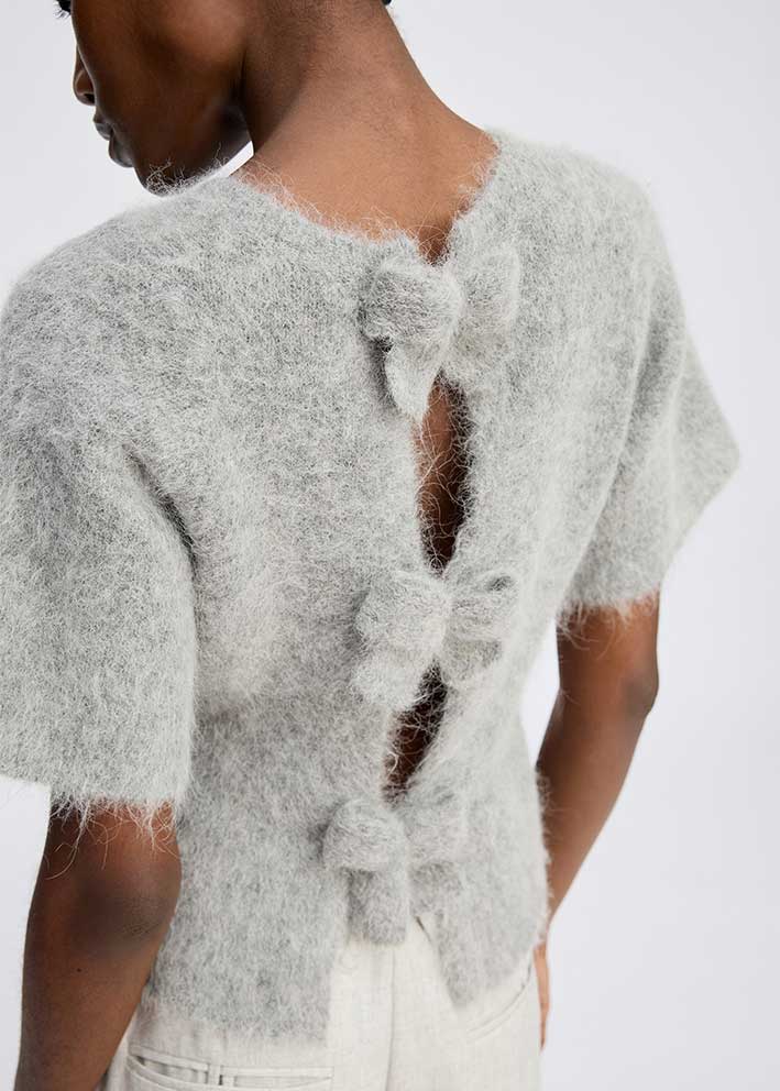Smuk blød, kortærmet grå Rylaline strik fra Munthe, designet med tre smukke sløjfer på ryggen. Strikken har rund hals, halvlange ærmer og den nederste del er designet med en let peplum-effekt.