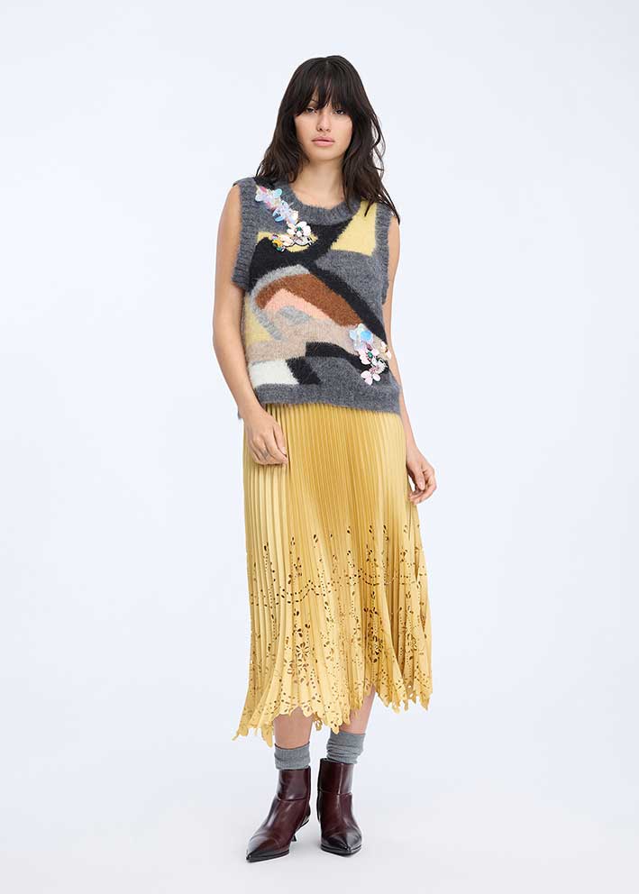 Fantastisk smuk, blød og helt unik Rubble strikvest fra Munthe, desgnet med et elegant, abstrakt mønster i grå, gule og jordnære nuancer. Vesten er prydet med glitrende applikationer og blomsterdetaljer, der giver et smukt og kunstnerisk udtryk.