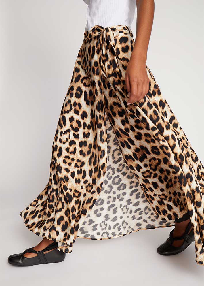 Elegant leoprintet Ubba slå-om-nederdel fra Munthe, designet med fin binde detalje i taljen og længde til anklerne.