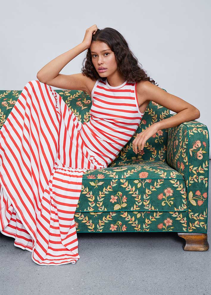 Kjolen har klassiske striber i rød og creme - og elegante overskæringer i skørtet, der gør at den sidder super flot og flatterende.
