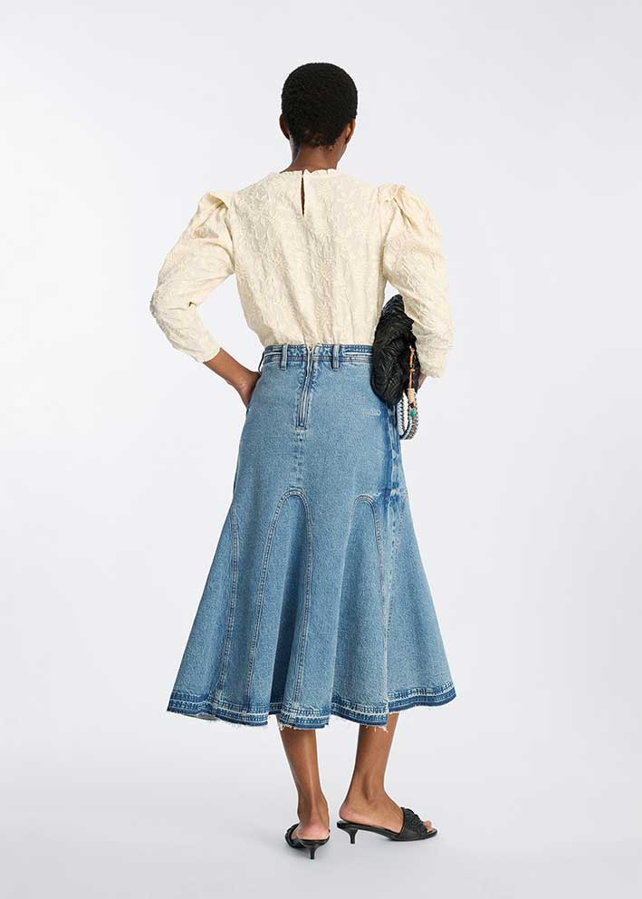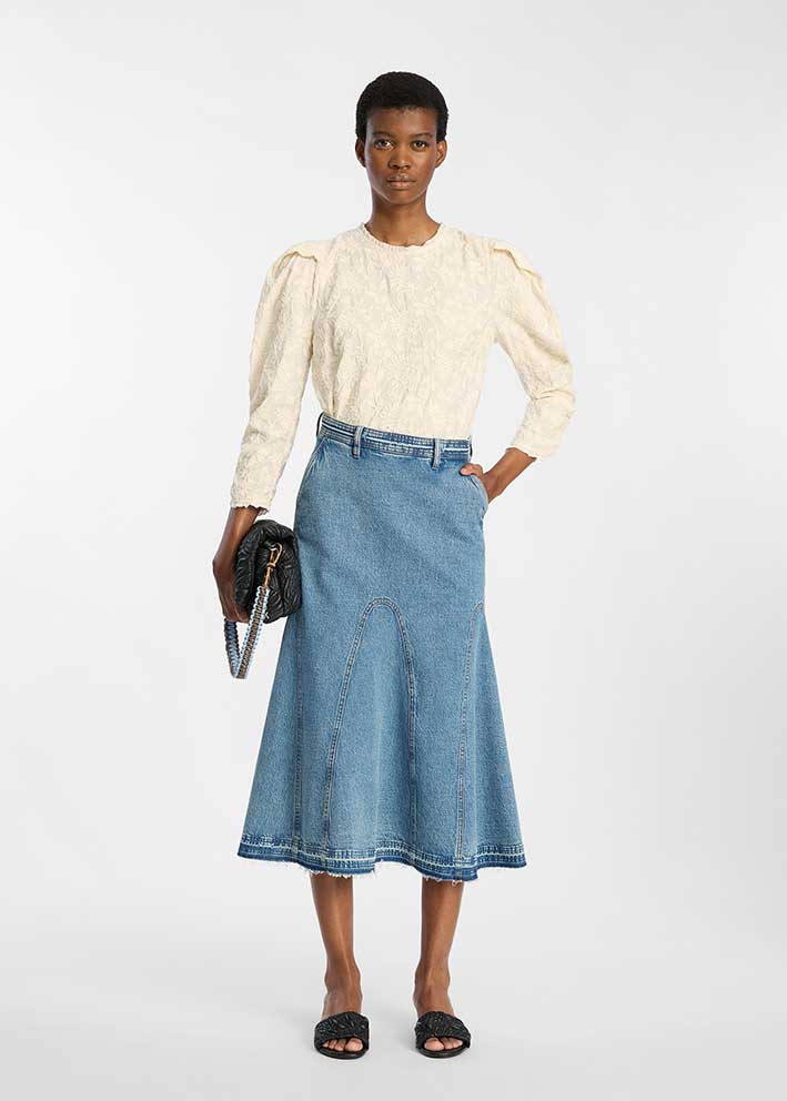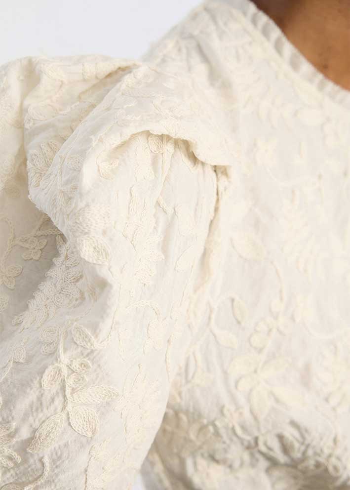 Smuk cremehvid Benicio bluse fra Munthe, designet i et tekstureret jacquardmateriale med diskret mønster. Modellen har lange let puffede ærmer, let rynkede detaljer og en enkel, rund halsudskæring.