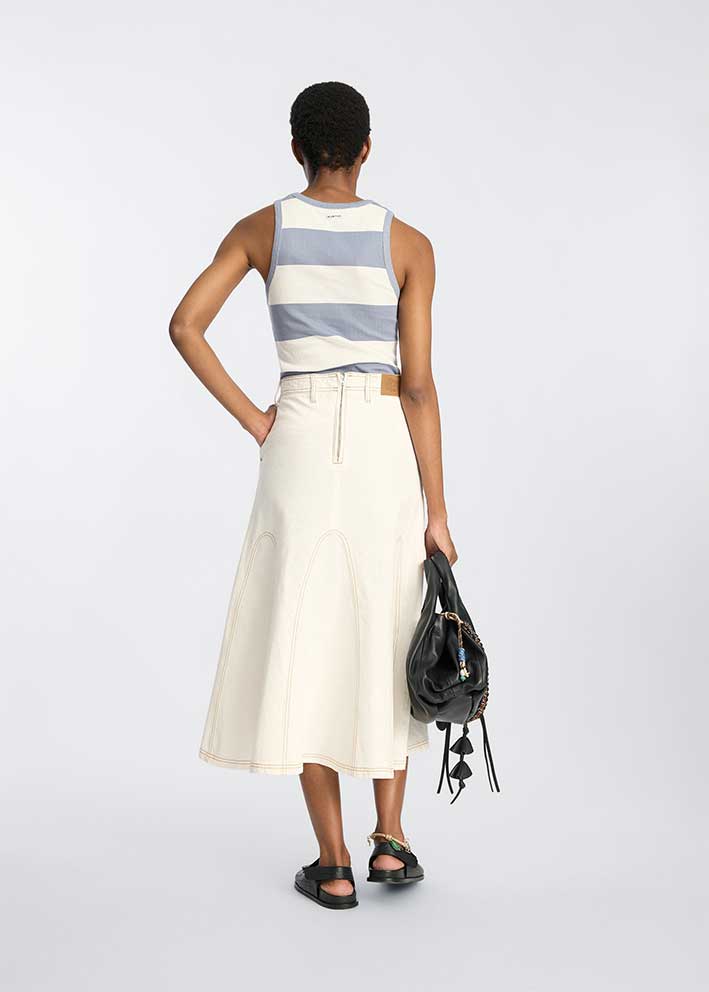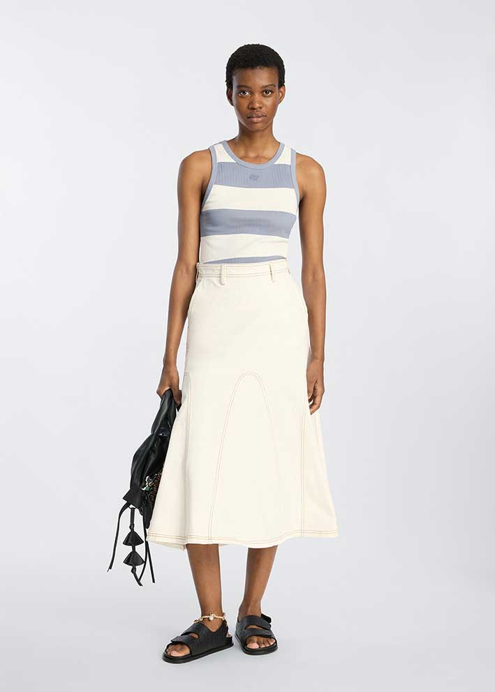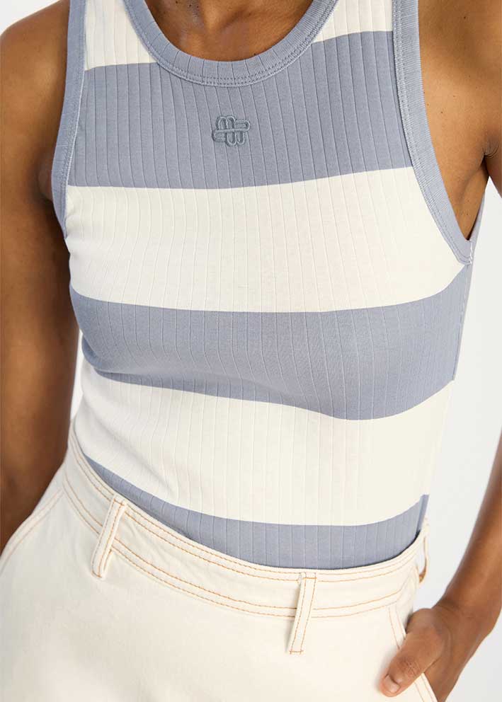 Fremstillet i 100% økologisk bomuld sikrer Tezza toppen maksimalåndeevne og komfort på varme dage. Det klassiske stribet mønster giver et nautisk og friskt udtryk, mens den enkle tanktop-silhuet gør den utrolig let at style. Her eks. vist med den fikse Braylin nederdel.