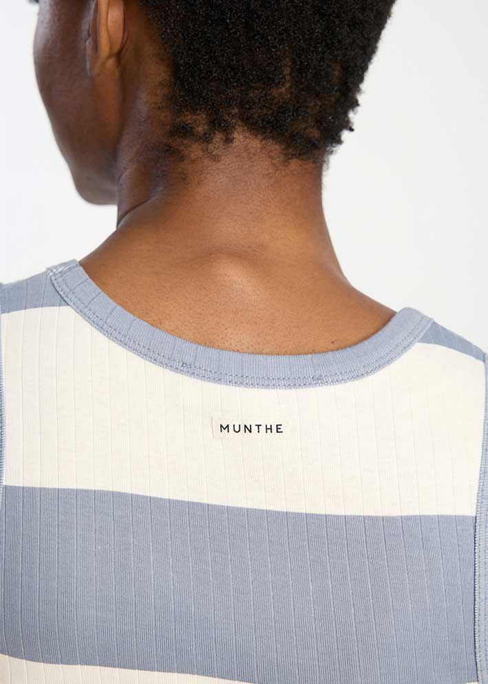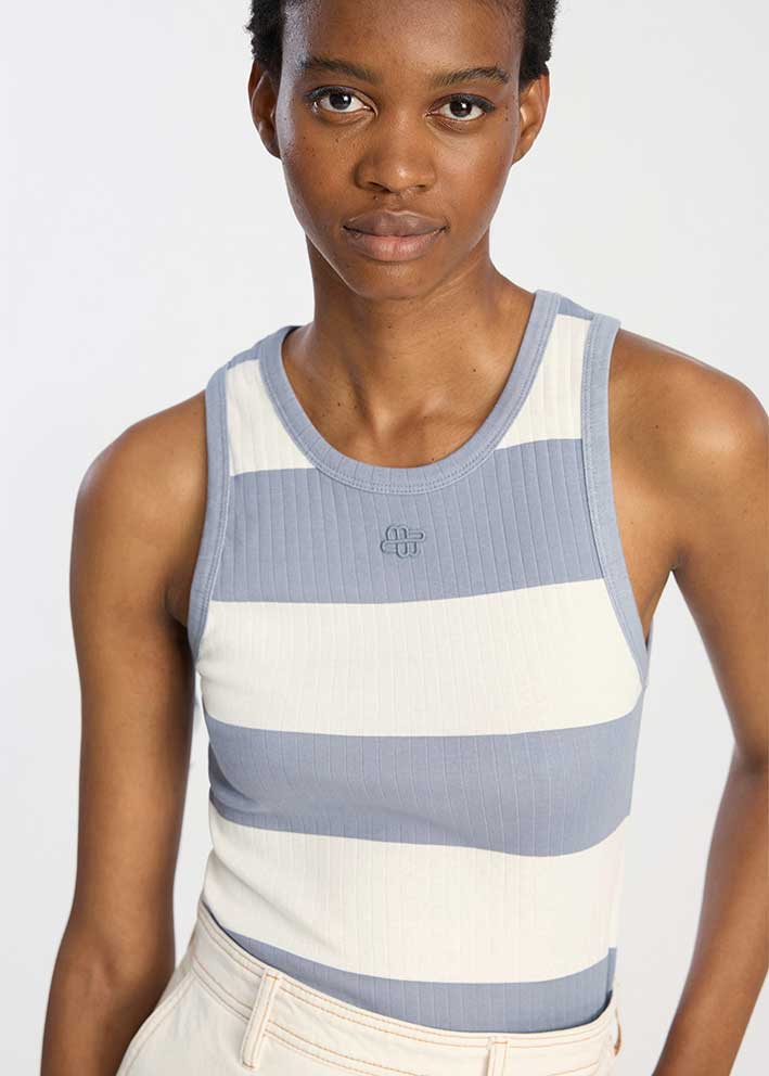 Tezza toppen fra Munthe er en klassisk stribet tanktop, der kombinerer tidløs stil med bæredygtig komfort. Med sit friske blå og hvide stribet design er denne top en alsidig favorit til sommerens garderobe.