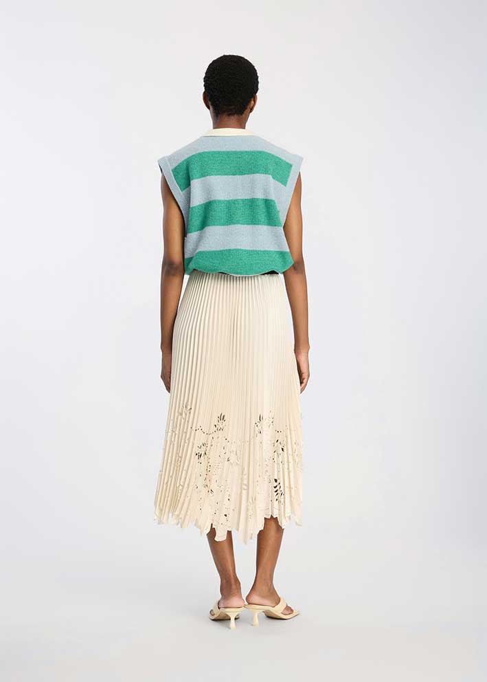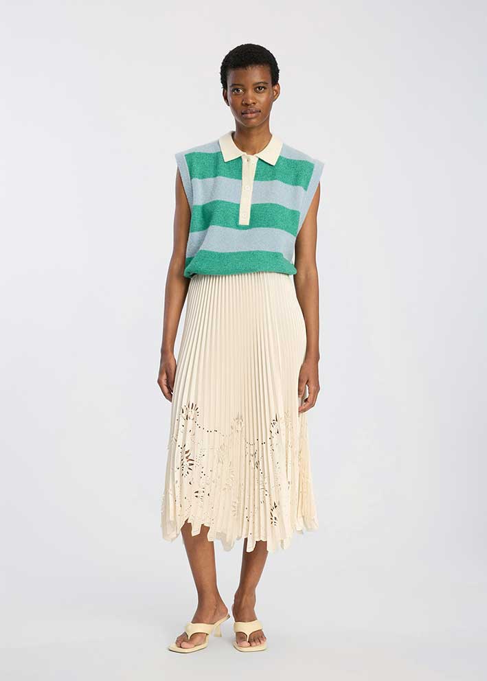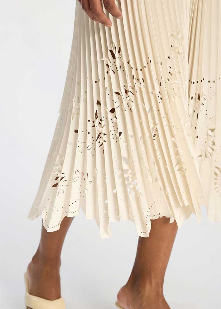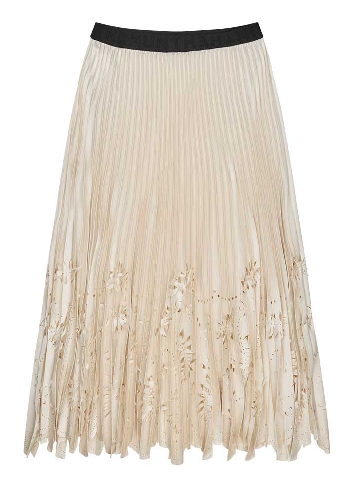 Fremstillet i 100% genbrugspolyester kombinerer Charming nederdelen stil med ansvarlighed. De fine plisseringer skaber en smuk bevægelse og et feminint udtryk, mens den lange silhuet giver en elegant og tidløs look. Den bløde kit-farve er let at style og passer perfekt til både vinter- og sommerfester.