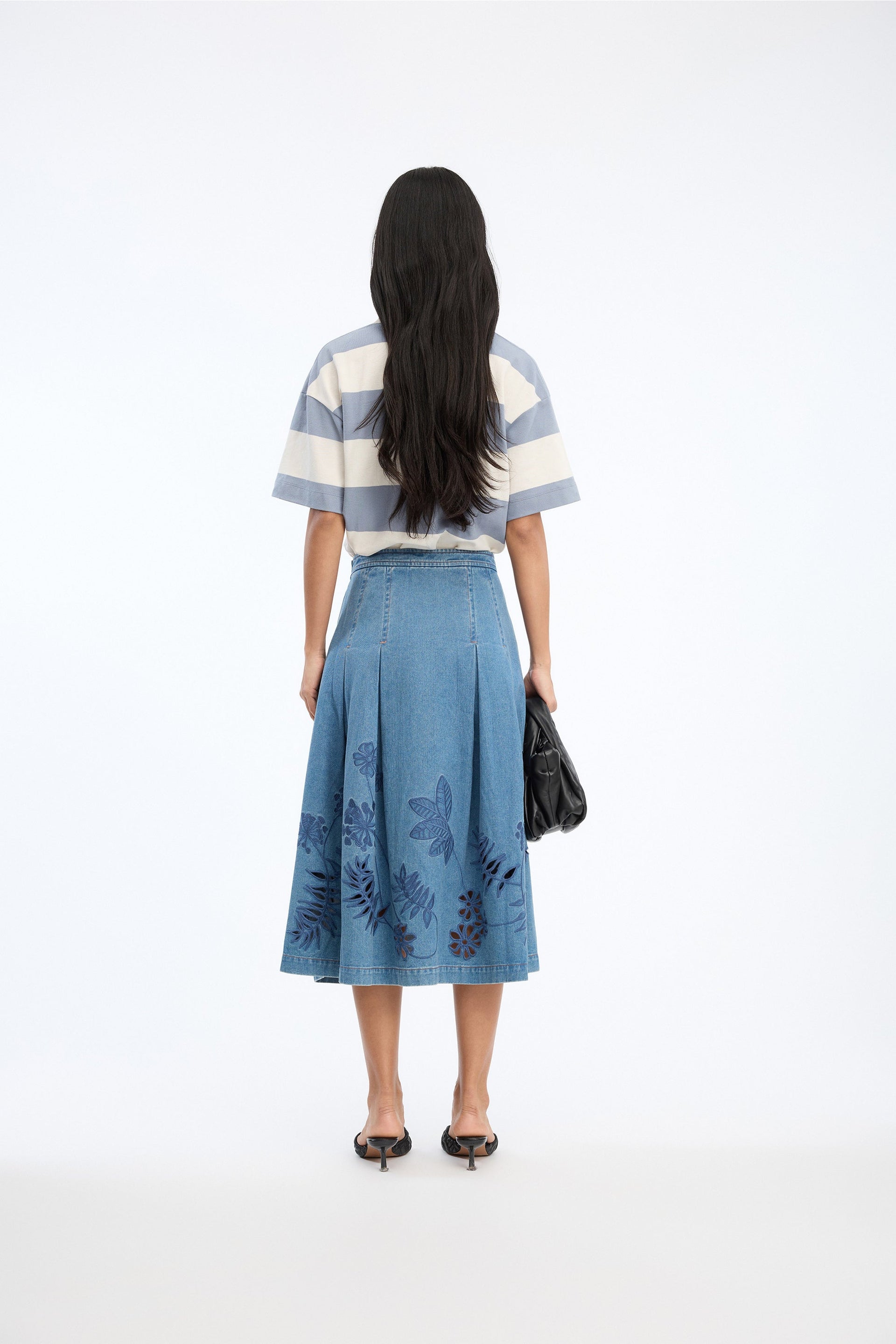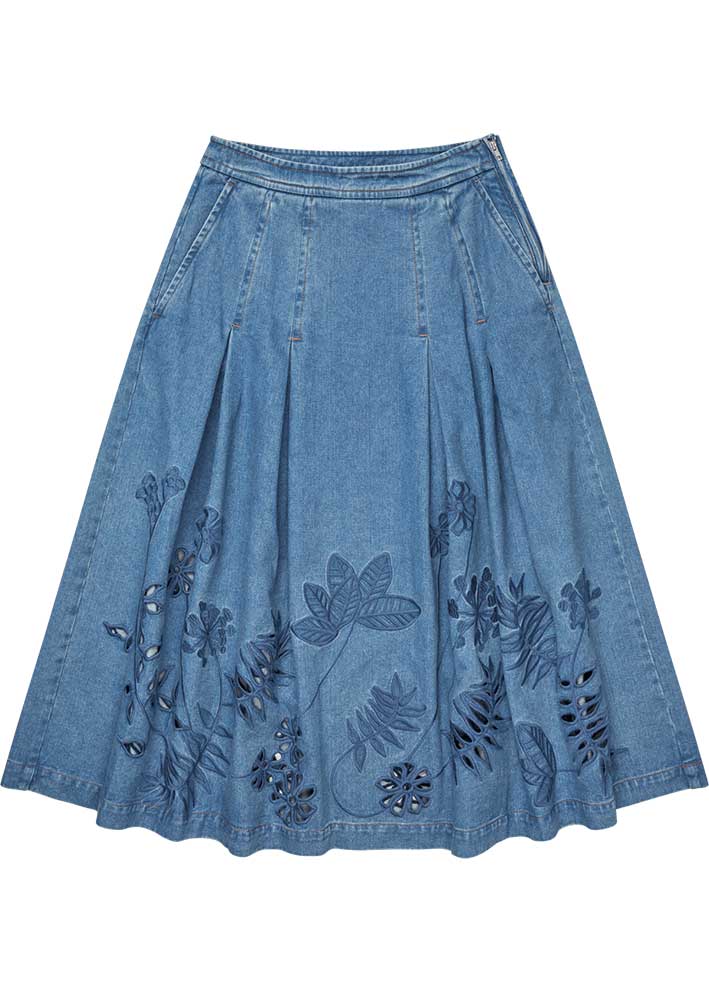 Skøn og helt unik Bowen denim nederdel fra Munthe, designet med broderede blomster- og bladmotiver langs kanten. Nederdelen har en A-formet silhuet med masser af vidde og sidelommer for et afslappet look.