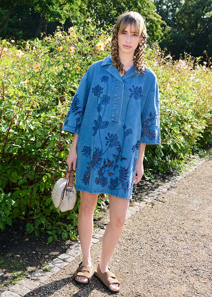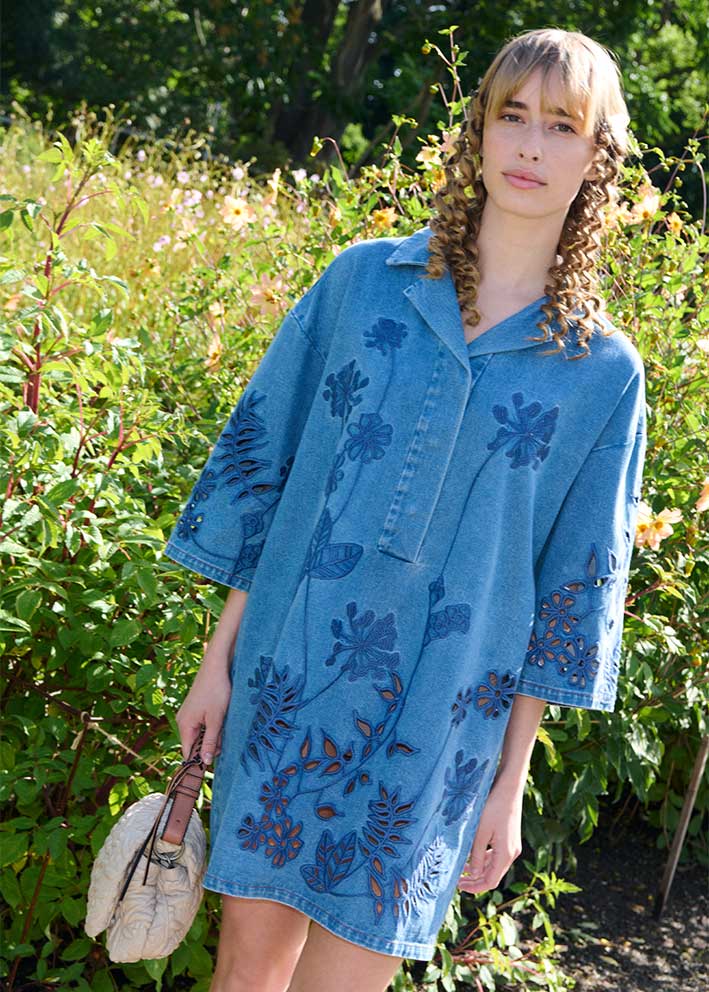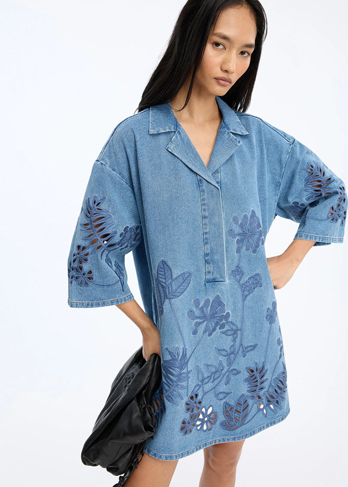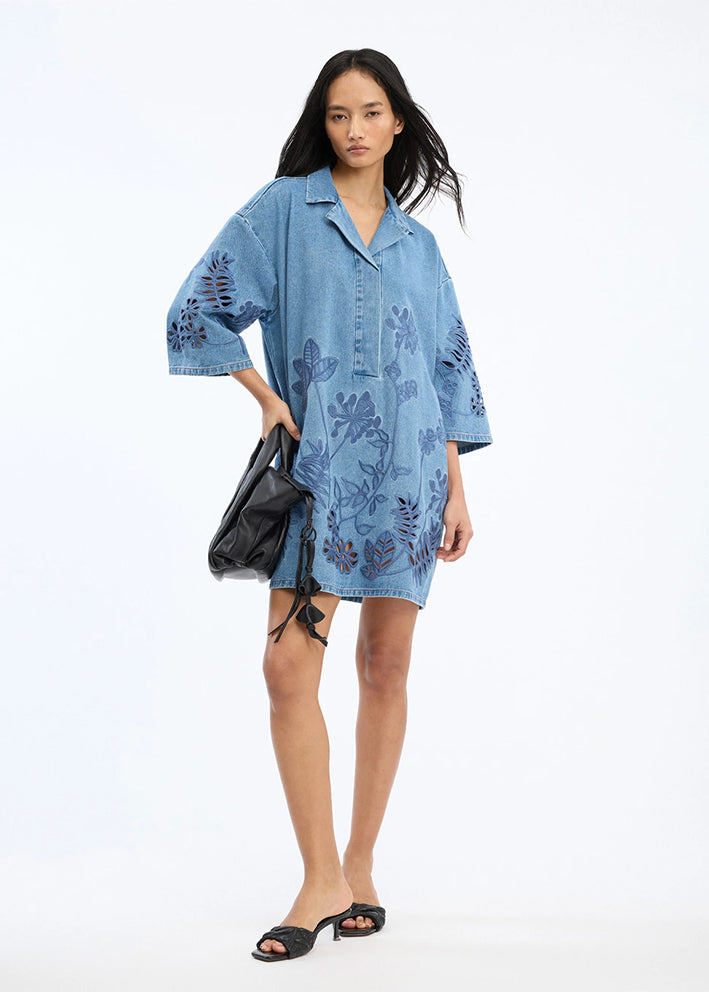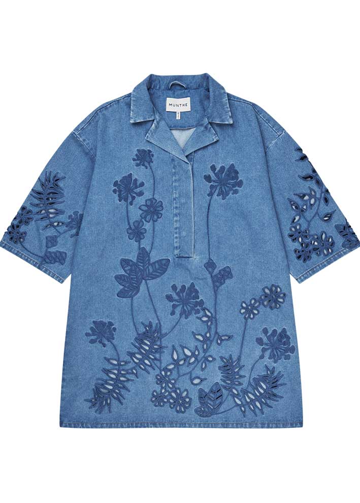 Umådelig smuk og helt unik Bellar denim skjortekjole fra Munthe, designet med tone-i-tone broderede blomsterdetaljer og hulmønster forneden. Modellen har en afslappet, lige pasform, V-udskæring med lille krave samt korte, rummelige ærmer.