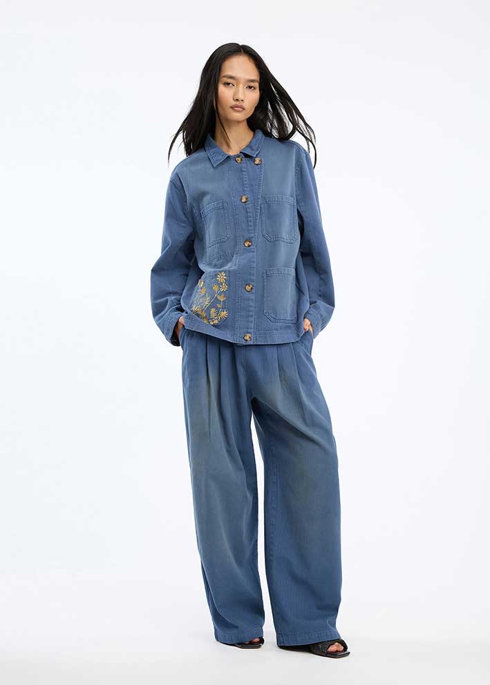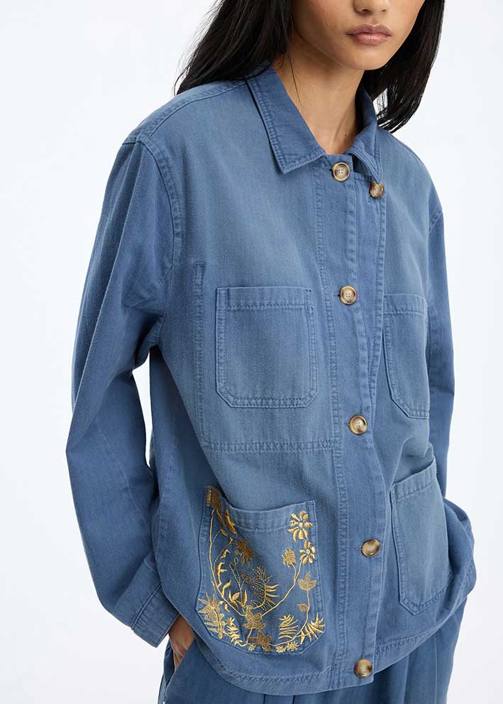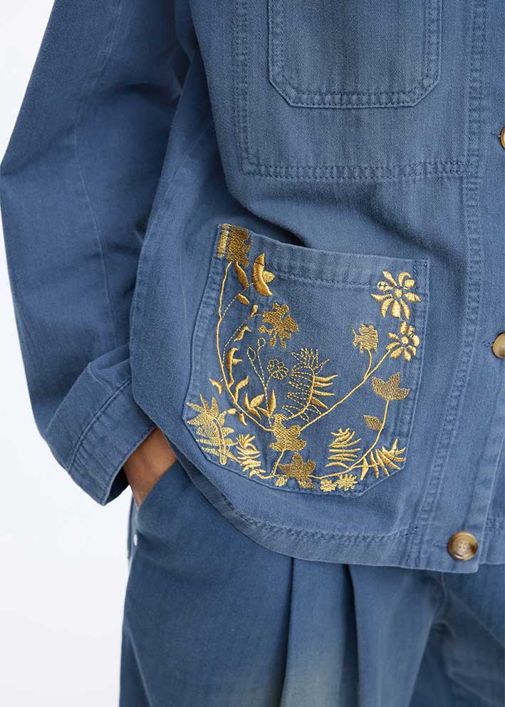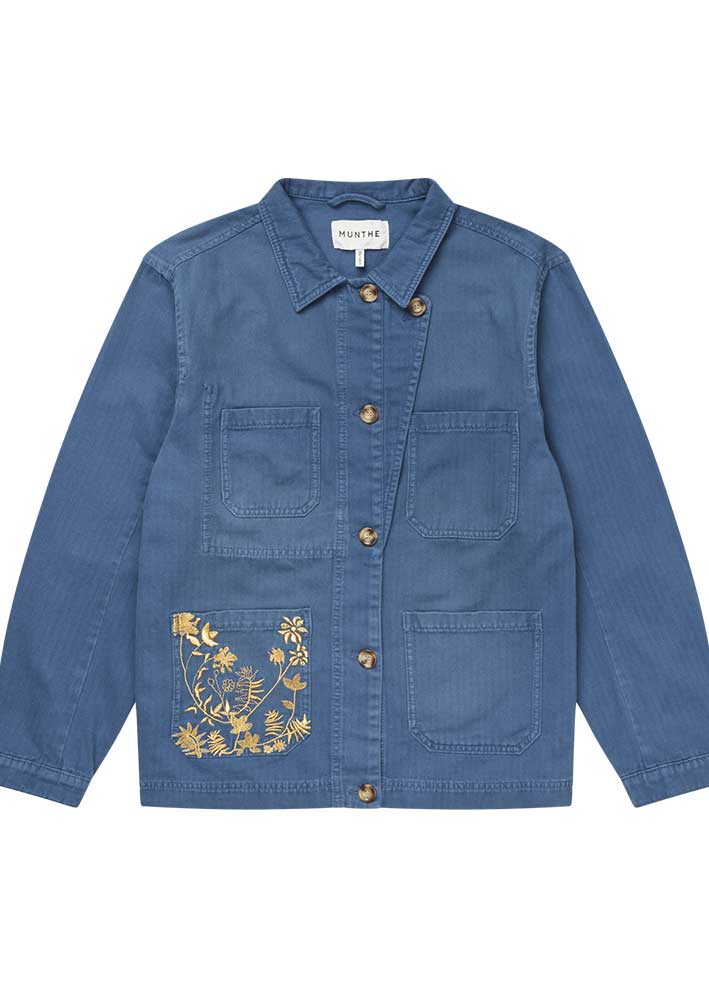 Bayan jakken med de gudesmukke gyldne broderier fra Munthe er den perfekte denimjakke til foråret og de kølige sommeraftener. Med sit klassiske blå denim-look og moderne design er denne jakke en tidløs favorit, der passer til enhver garderobe.