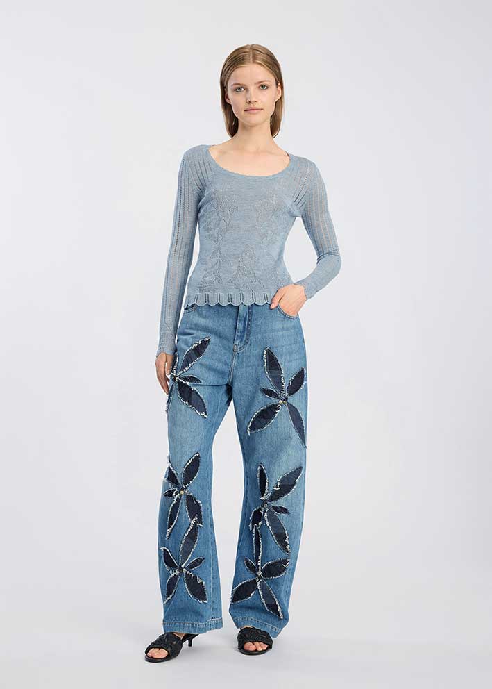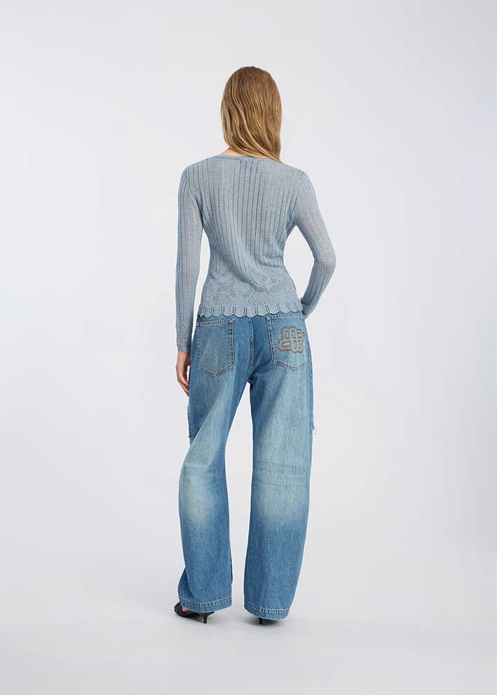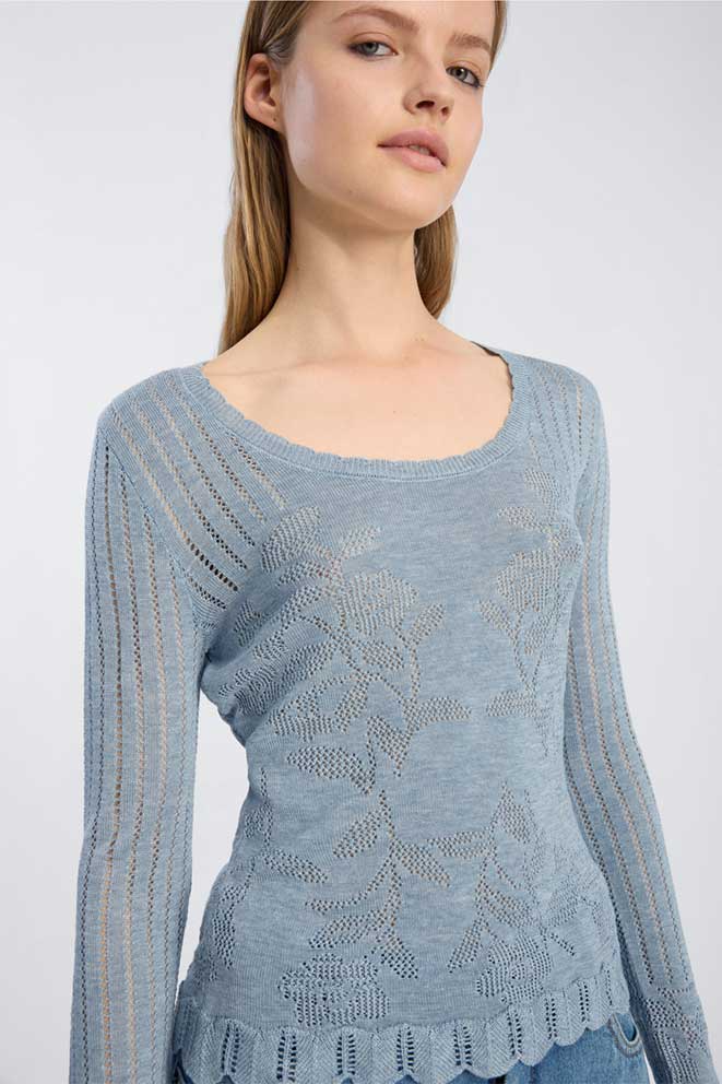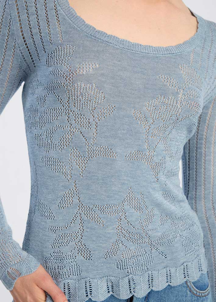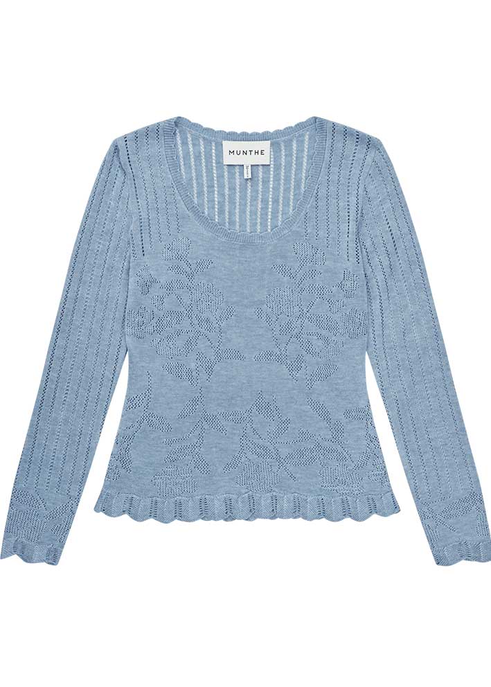 Smuk lyseblå langærmet Bayard strikbluse fra Munthe, designet med dyb rund hals og open-knit mønster med blomsterdetaljer. Blusen har en tætsiddende pasform, rund hals og bølgede kanter ved bund og ærmer.