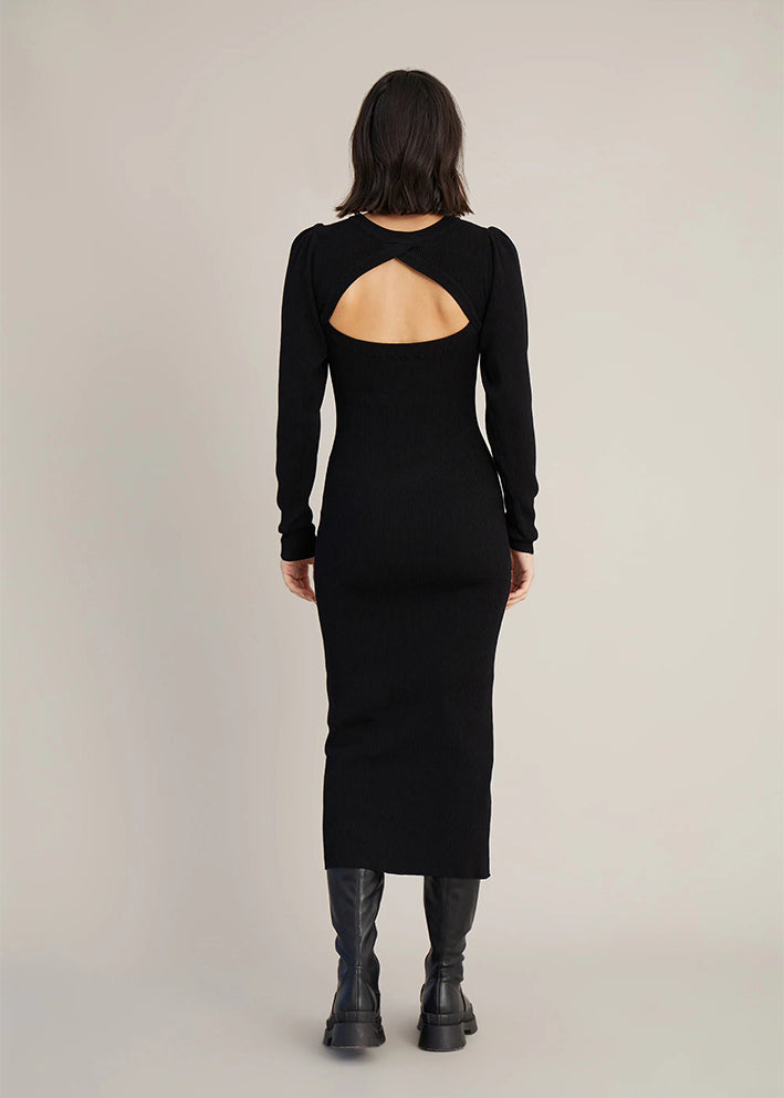 Smuk, feminin og velsiddende lang sort Dallen kjole fra Munthe, designet i et lækkert ribstrikket viskose-miks. Kjolen har rund hals, lange ærmer, cut-out på ryggen og en fantastisk pasform. Sidder forholdsvis tæt og er super behagelig at have på.