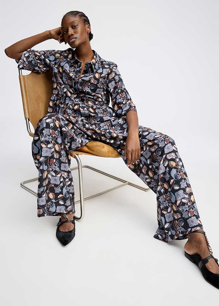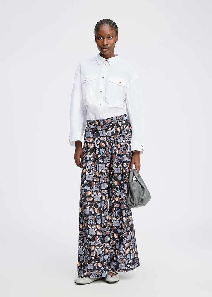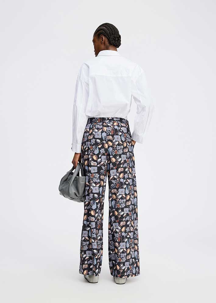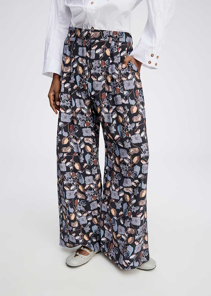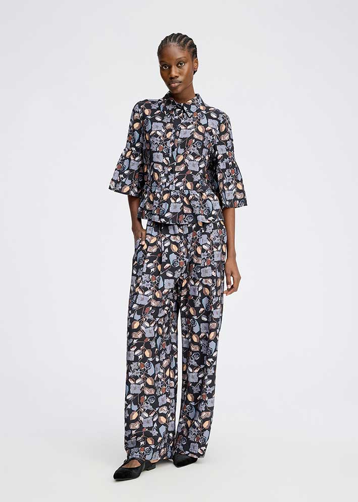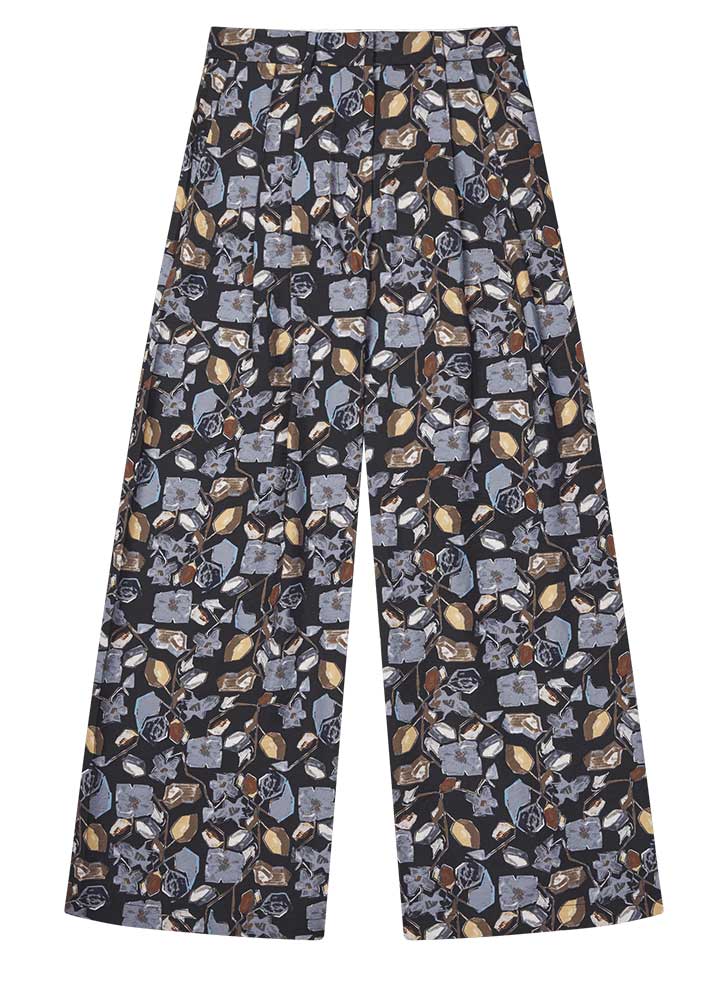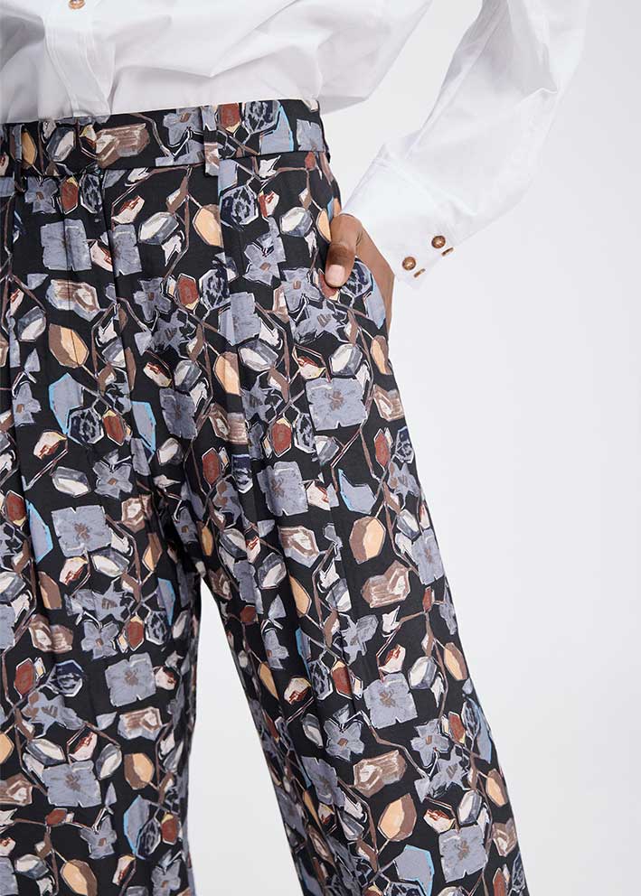 Smukke og super elegante Faicus bukser fra Munthe, designet med vidde i benene og et smukt, grafisk blomstermønster. Bukserne har fine læg, bæltestropper, lommer og en enkelt knaplukning.