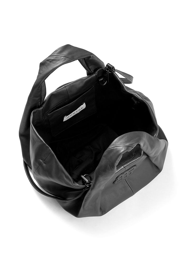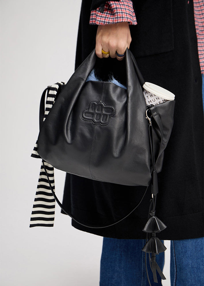 Smuk klassisk sort Lix taske fra Munthe, lavet af blødt læder med to fine, brede hanke og et smukt MUNTHE-emblem på siden. Tasken er er super rummelig og designet med en aftagelig skulderrem og har indvendigt et stort rum samt en mindre lomme i siden.