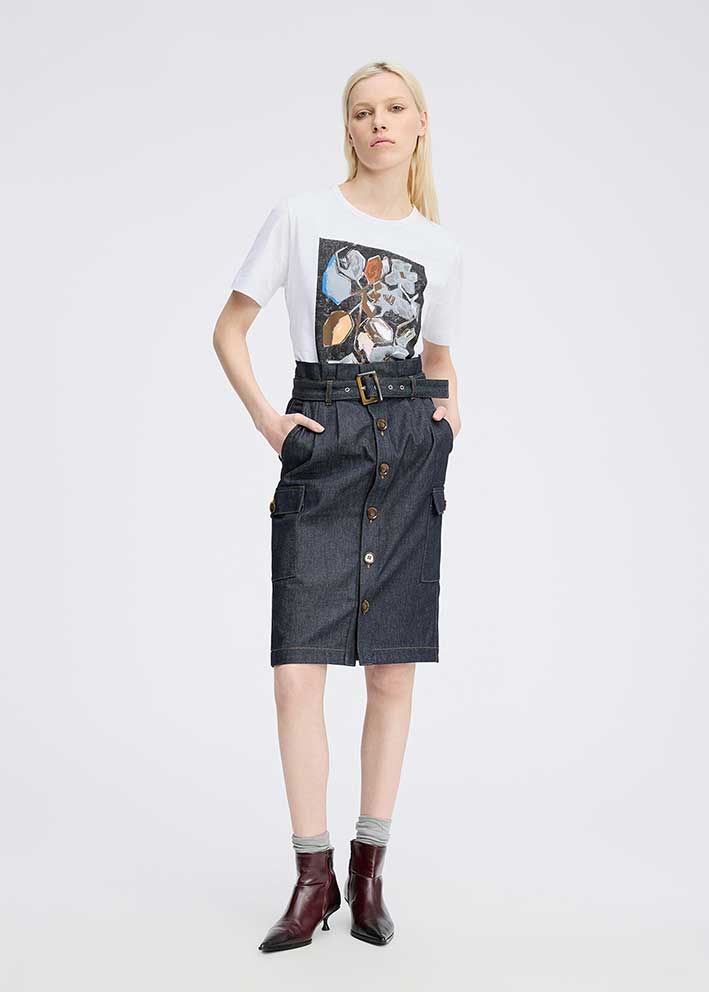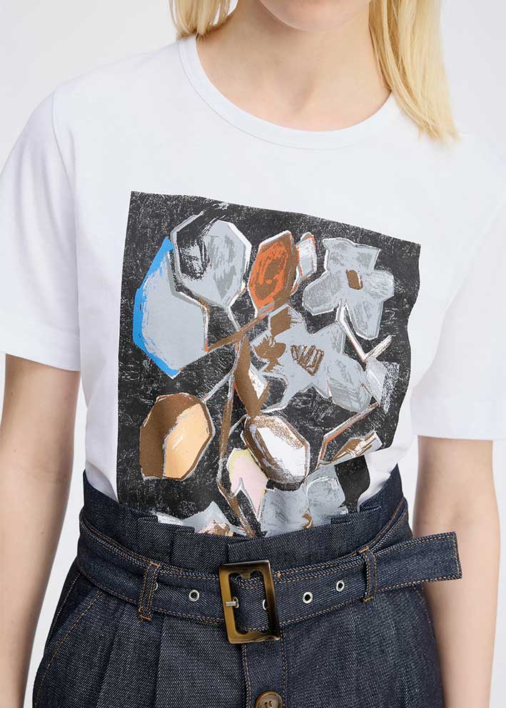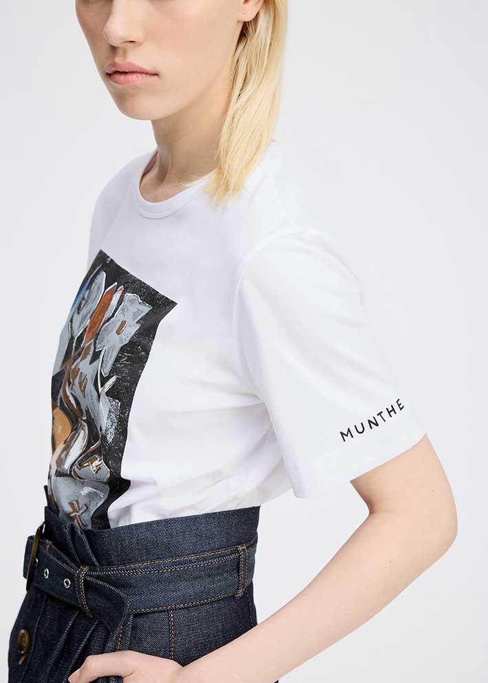 Klassisk Rascali T-shirt fra Munthe, designet med et stort smukt MUNTHE kunstprint på brystet og et diskret logo på ærmet.
