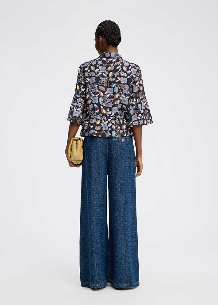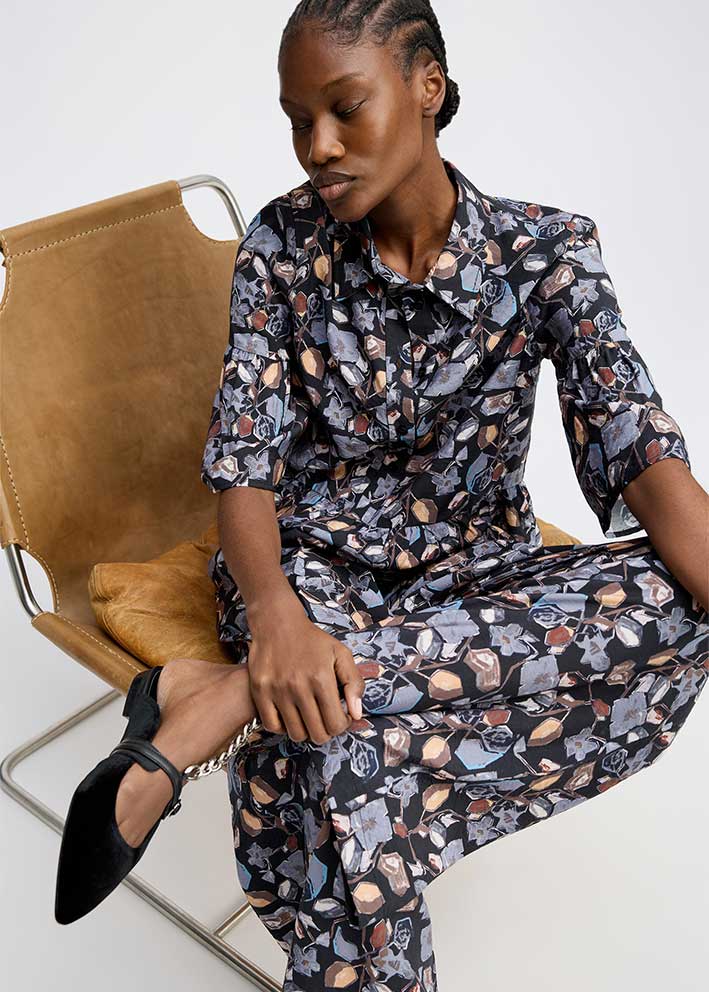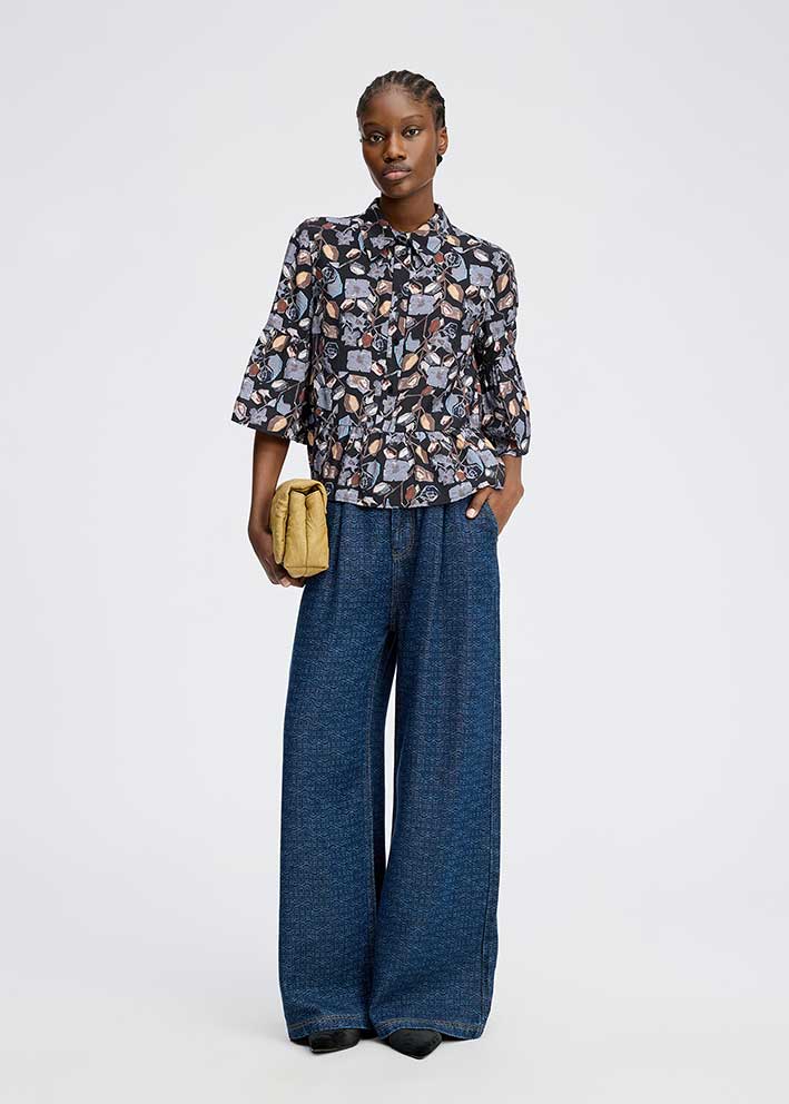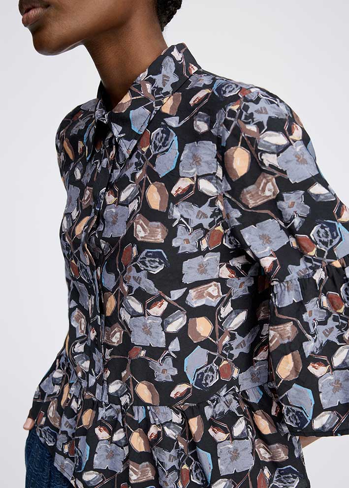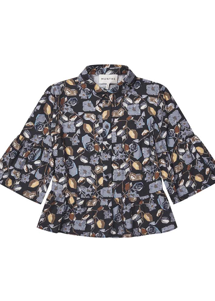 Smuk og feminin Rosewell skjortebluse fra Munthe, designet med et smukt blomsterprint. Skjorten har en klassisk krave, brede 3/4-ærmer, en elegant peplum-talje og stolpelukning med knapper.
