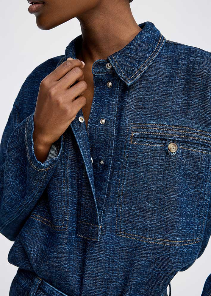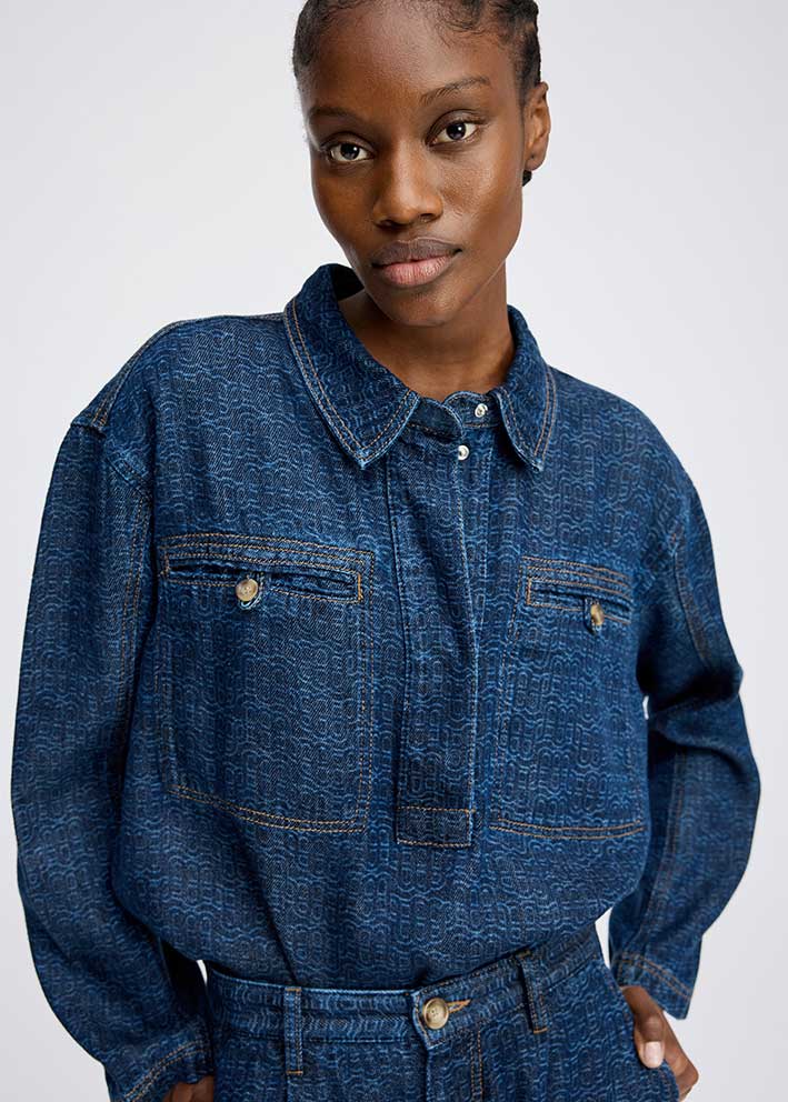 Smuk mørkeblå Ruxa denimskjorte fra Munthe, designet i et boxy fit med diskret logomønster, skjult knaplukning samt brystlommer med knapper.