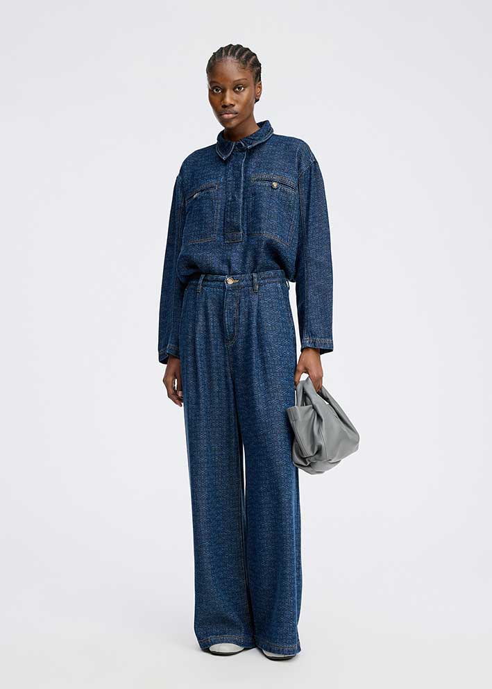 Pleje: For at holde dit rå denim pænt, anbefaler vi at vaske det skånsomt på et mildt program, med skånsomt vaskemiddel. På grund af rå denims natur, kan der forekomme en naturlig farveændring med tiden – det er helt normalt og giver dit denim et unikt look over tid.