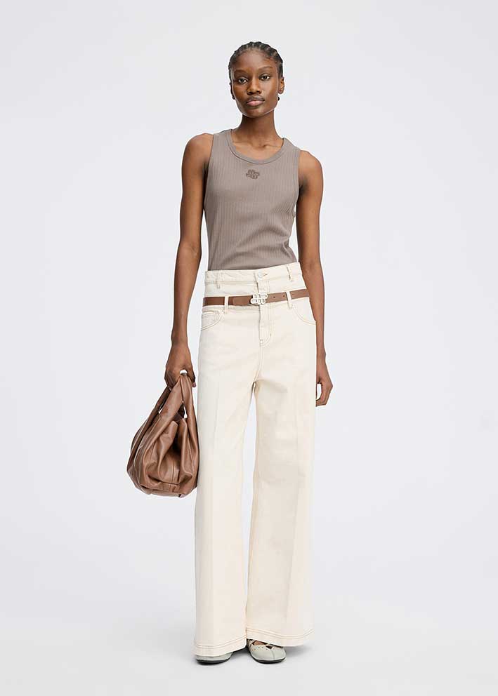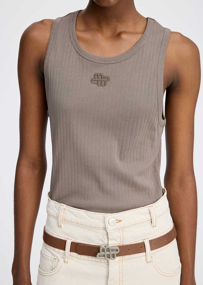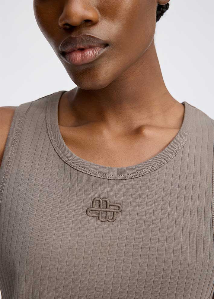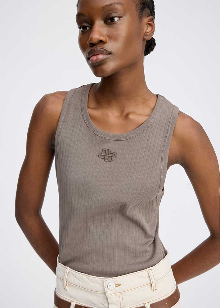 Smuk moccabrun Tezza tank top fra Munthe, designet i 100% økologisk bomuld med et elegant MUNTHE emblem broderi på brystet. Toppen er designet i en ribbet tæt pasform med en rund halsudskæring.