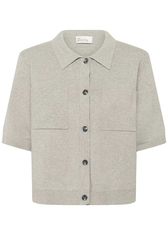 Mød Stino Cardiganen fra My Essential Wardrobe — en tidløs strikket cardigan i en blød Medium Grey Melange, der nemt løfter ethvert look fra hverdagssimpelt til elegant afslappet.