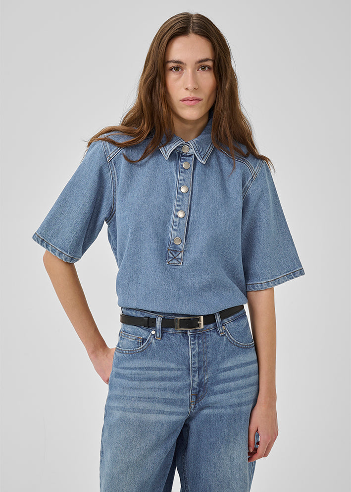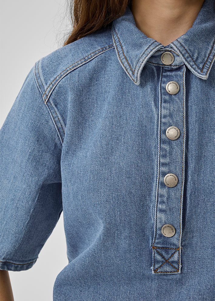 Skøn kortærmet Abina denimbluse fra MEW, designet i et enkelt boxy snit med lille krave, stolpelukning med trykknapper og halvlange ærmer.