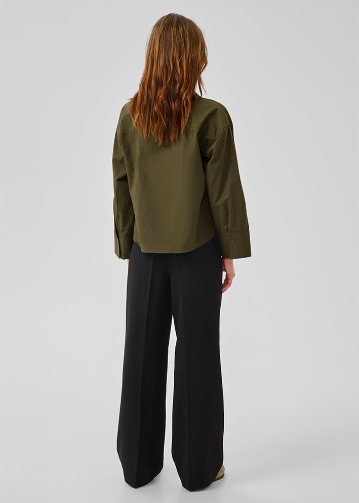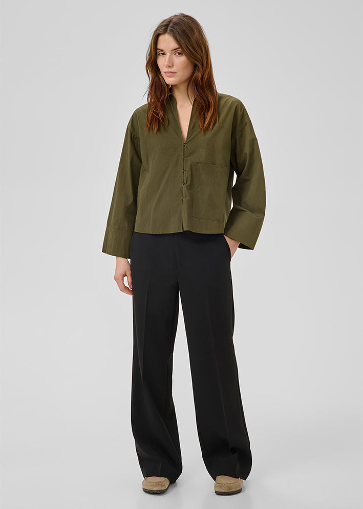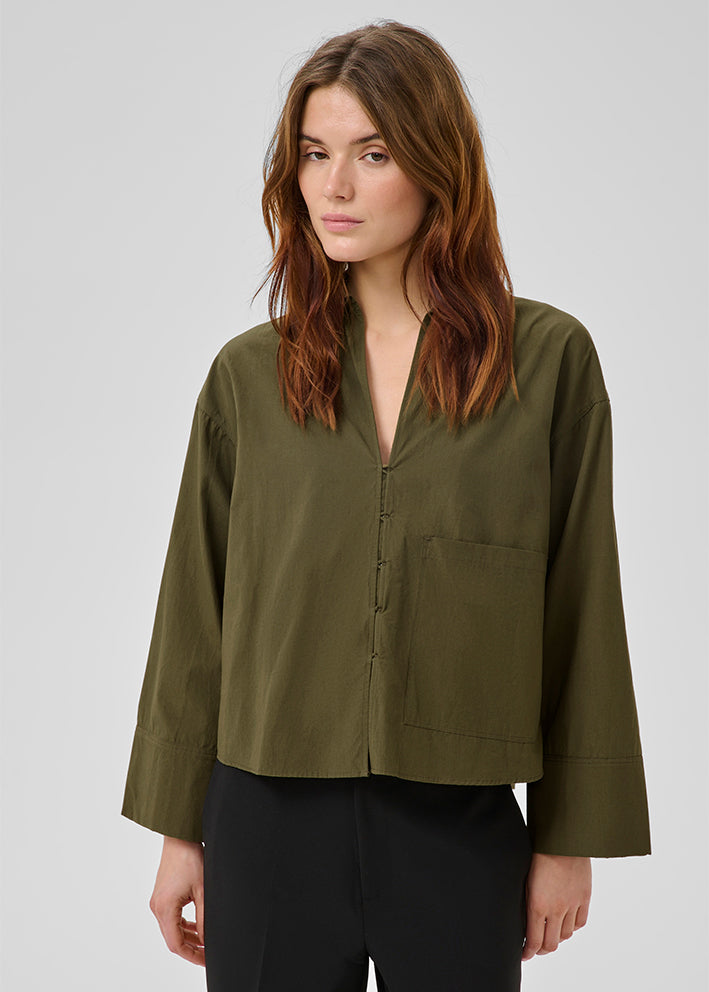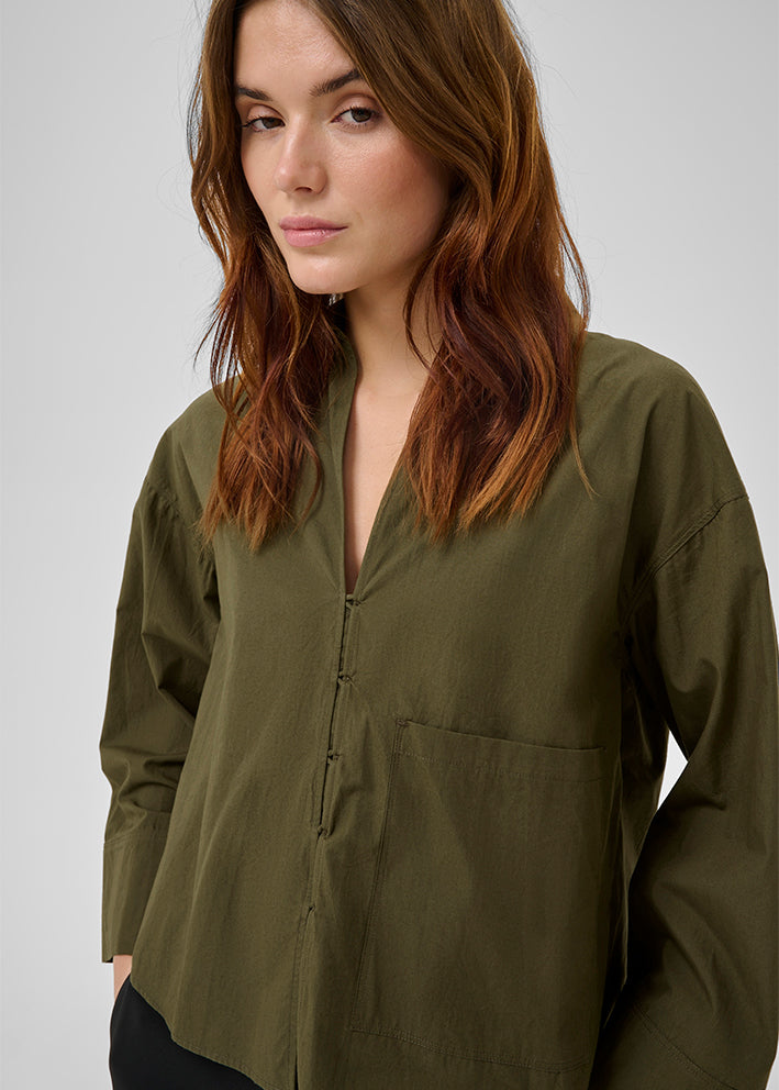 Skøn mørkegrøn Sunna skjorte fra MEW, designet i en lækker 100% økologisk bomuld. Skjorten har et enkelt boxy fit, almindelig skjortekrave, v-hals, skjult knaplukning, lange ærmer og en enkelt påsat lomme.