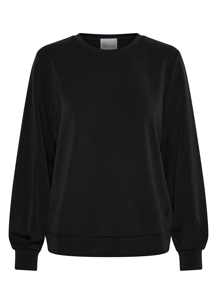 Skøn sort sweatshirt fra My Essential Wardrobe, designet med blød overflad, klassisk rund halsudskæring og lange ærmer. Ribkanterne på ærmer og bund giver et afslappet, stilrent udtryk.