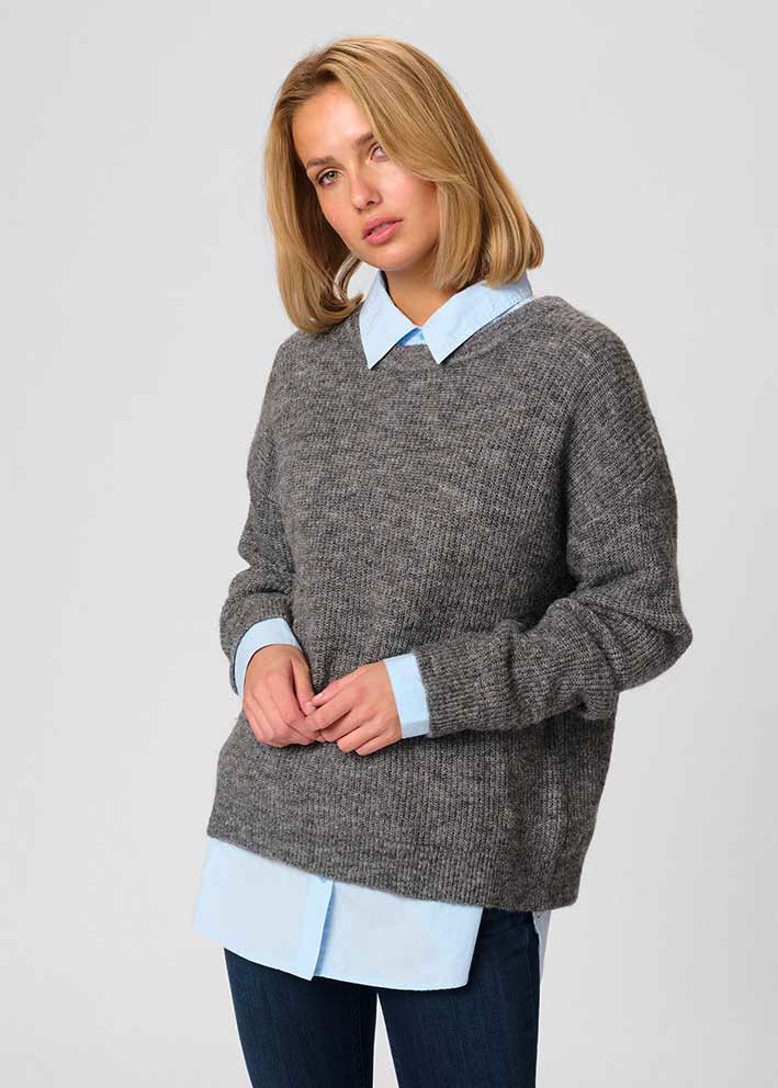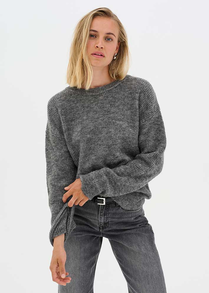 Skøn klassisk mørkegrå-meleret sweater fra My Essential Wardrobe, ribstrikket i en lun kvalitet med uld og alpaka. Sweateren har et lige snit og blød, let tekstureret overflade, rund halsudskæring med rib og lange ærmer.