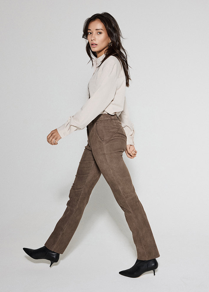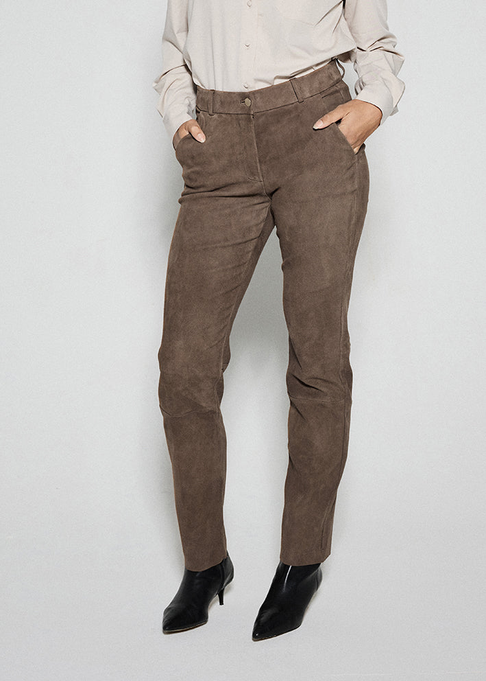 Fantastisk lækre ruskindsleggings fra Notyz, designet i et det blødeste og lækreste smidige/strækbare ruskind. Bukserne er designet med saddle back, som er en syning over bagdelen, der giver en rigtig flot pasform. Bukserne har høj talje, lynlås- og knapknaplukning samt skrå sidelommer med lynlås. Desuden dekorative sømme under knæene og rå kant forneden.