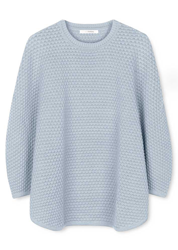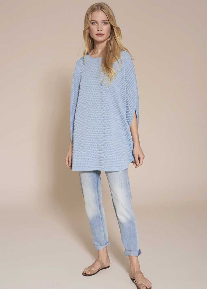 Superlækker lyseblå Adi poncho fra danske SibinLinnebjerg, mønsterstrikket i en dejlig blød og lun merinokvalitet. Modellen er perlestrikket, har rund hals med rib samt slidsåbninger til armene.