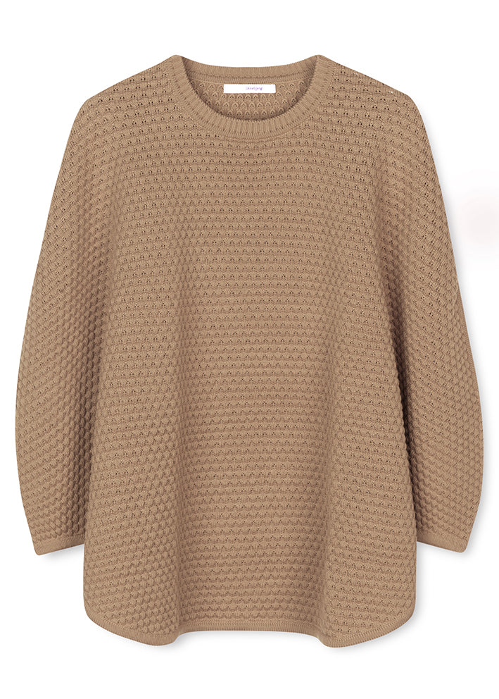 Smuk lys camelfarvet Adi poncho fra danske SibinLinnebjerg, mønsterstrikket i en dejlig blød og lun merinokvalitet. Modellen er perlestrikket, har rund hals med rib samt slidsåbninger til armene.