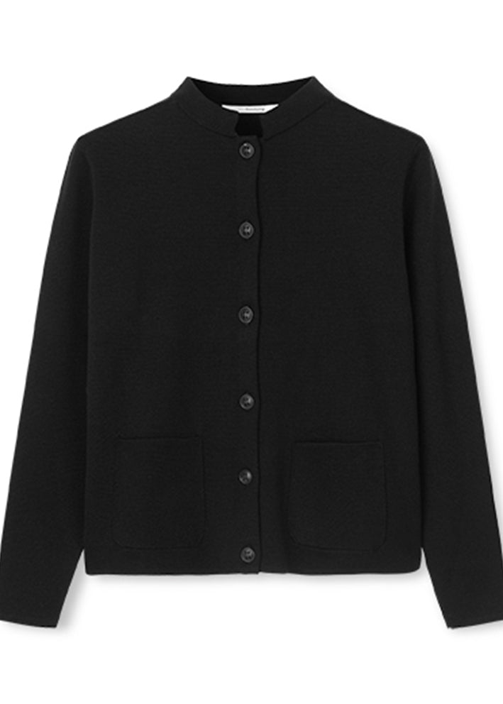 Skøn sort Dell cardigan fra Sibin Linnebjerg, fintstrikket i en lækker merinokvalitet. Cardiganen har rund hals med lille krave, knaplukning foran, lange ærmer og to frontlommer.