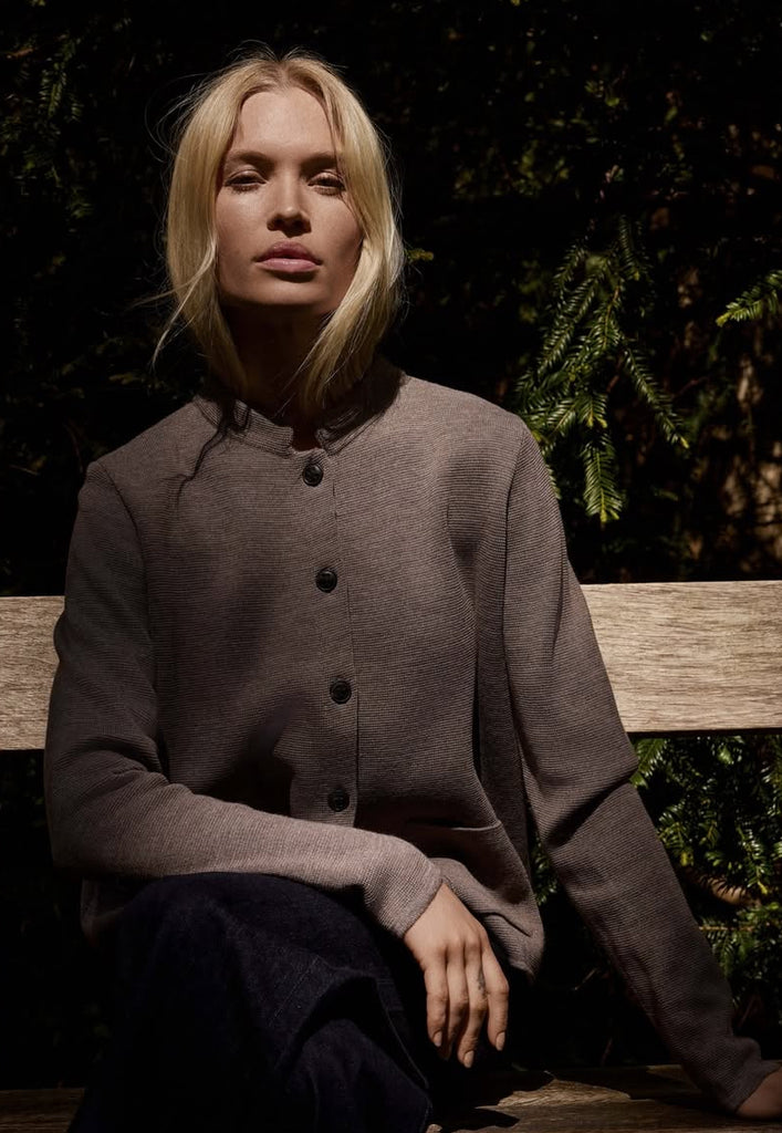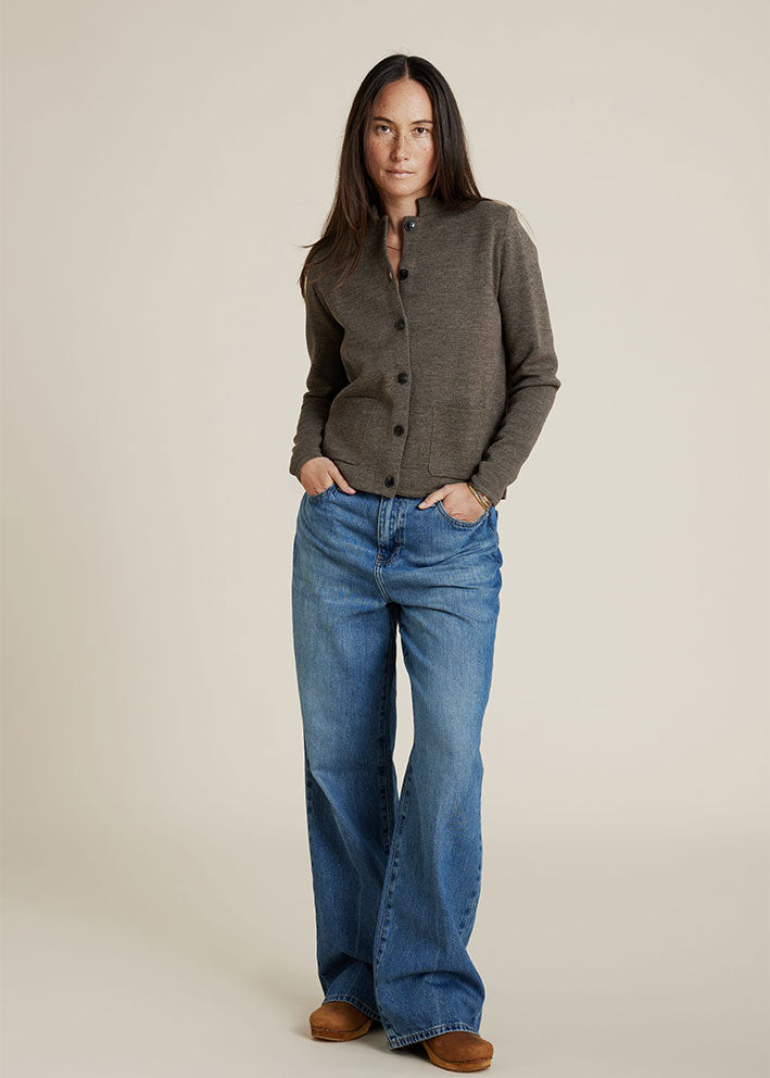 Skøn brun-meleret Dell cardigan fra Sibin Linnebjerg, fintstrikket i en lækker merinokvalitet. Cardiganen har rund hals med lille krave, knaplukning foran, lange ærmer og to frontlommer.