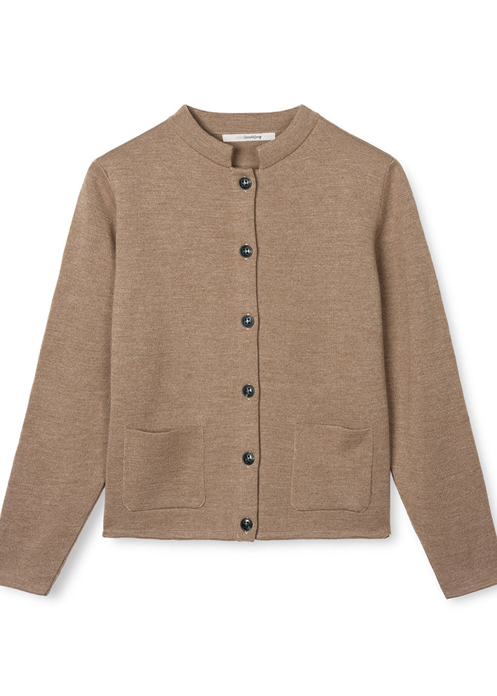 Skøn lys camelfarvet Dell cardigan fra Sibin Linnebjerg, fintstrikket i en lækker merinokvalitet. Cardiganen har rund hals med lille krave, knaplukning foran, lange ærmer og to frontlommer.