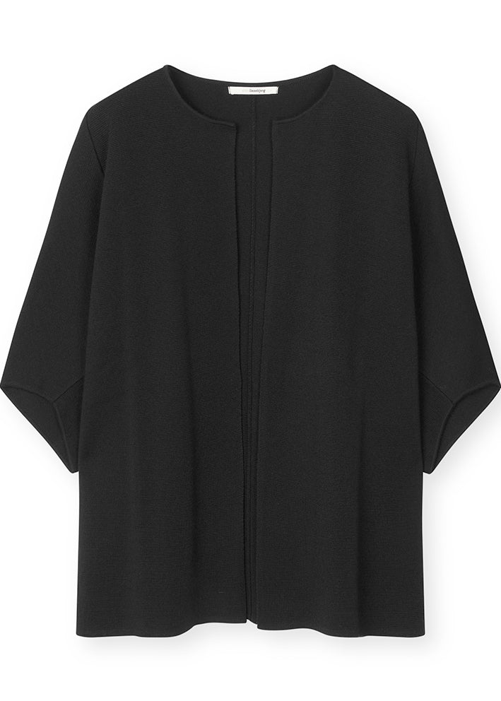 Skøn halvlang sort Evi cardigan fra Sibin Linnebjerg, fintstrikket i en lækker merinokvalitet. Cardiganen har et løst snit med rund hals, ingen lukning og halvlange ærmer.
