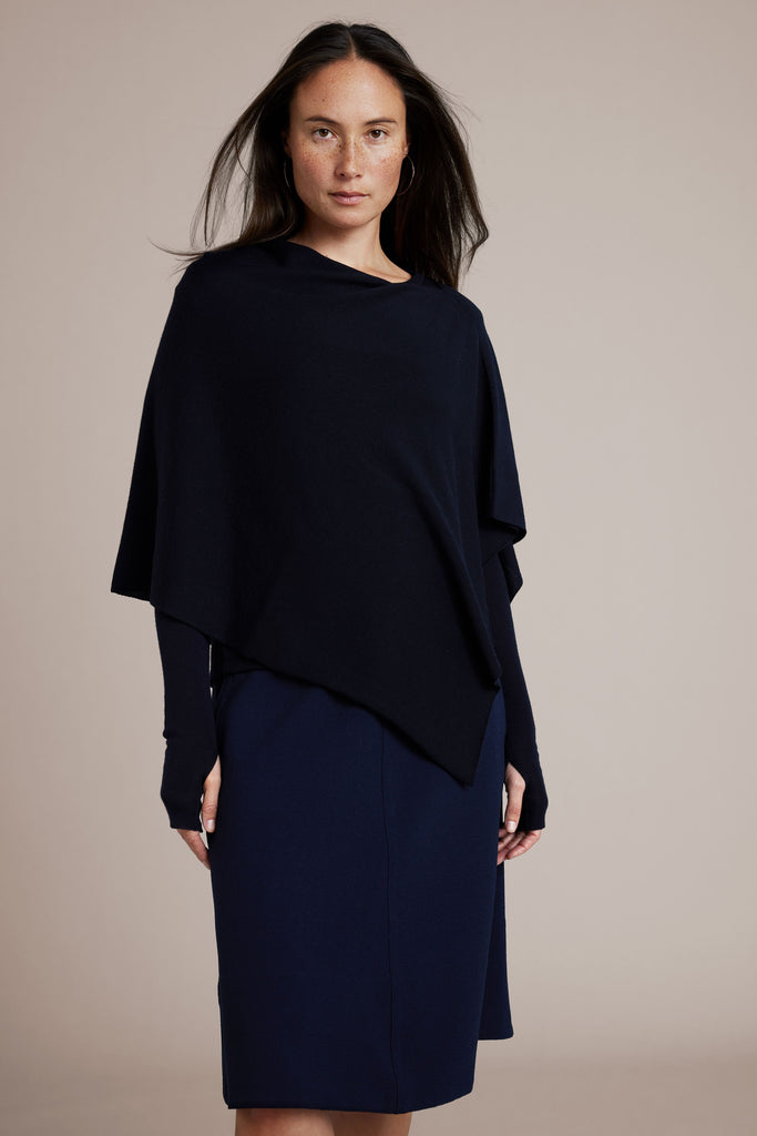 Superlækker sort Paris poncho fra Sibin Linnebjerg, finstrikket i megablødt og lækkert merino. Ponchoen er designet så den kan bæres på flere forskellige måder - på skrå, med v-hals eller med vandfald.