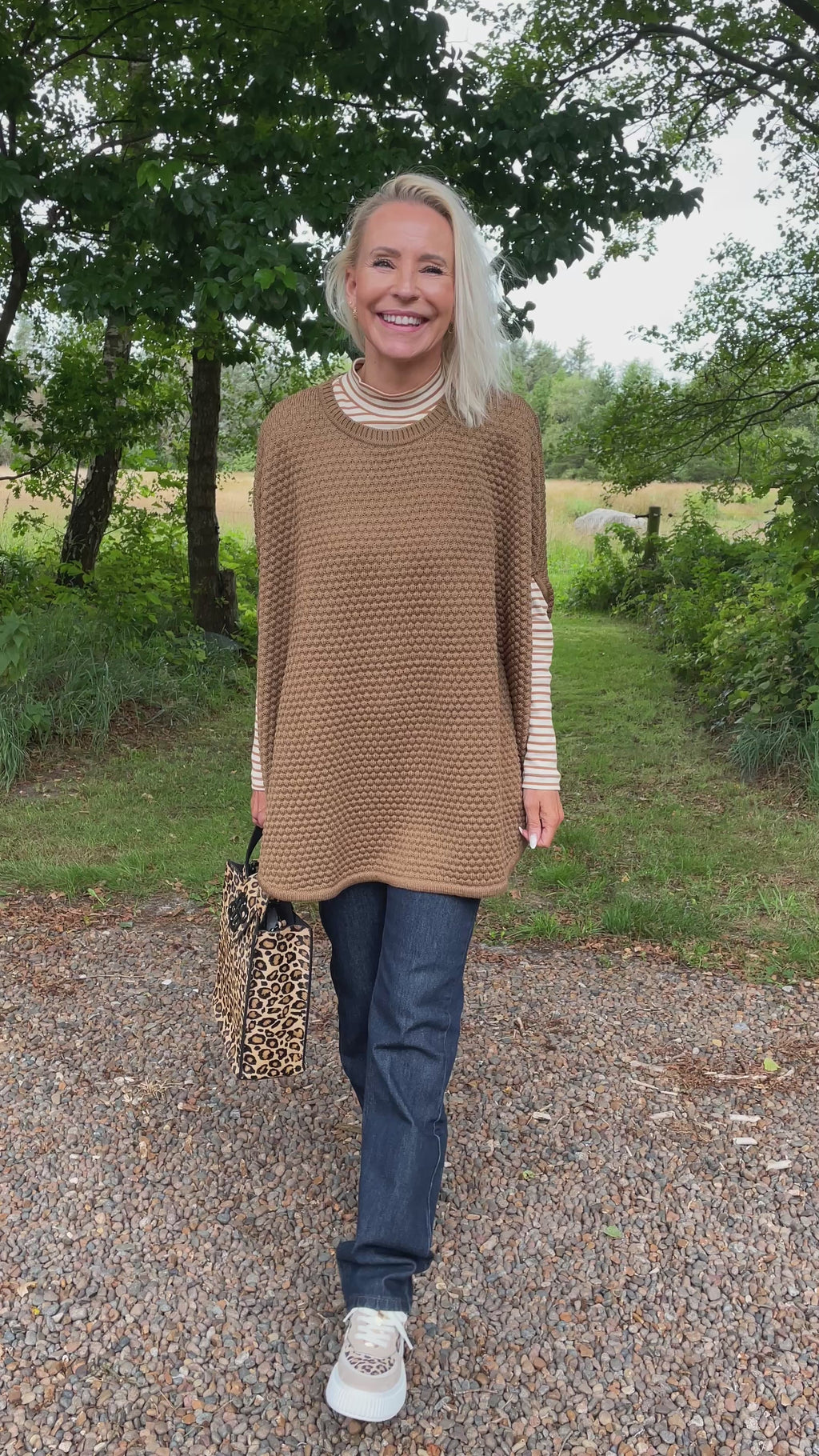Smuk camelfarvet Adi poncho fra danske SibinLinnebjerg, mønsterstrikket i en dejlig blød og lun merinokvalitet. Modellen er perlestrikket, har rund hals med rib samt slidsåbninger til armene.