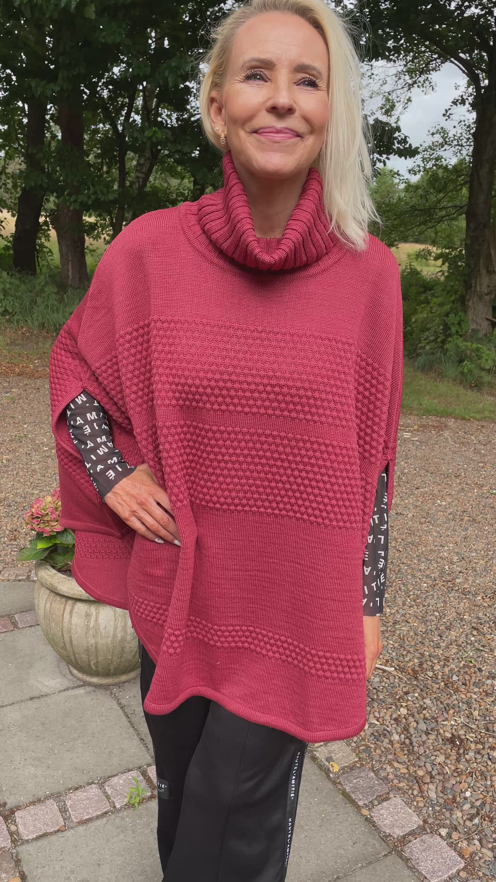 Smuk mørk rosa Siff poncho fra Sibin Linnebjerg. Super anvendelig og tidløs kvalitetsponcho strikket i sømandsmønster med perlestrik i en dejlig lun merinokvalitet.
