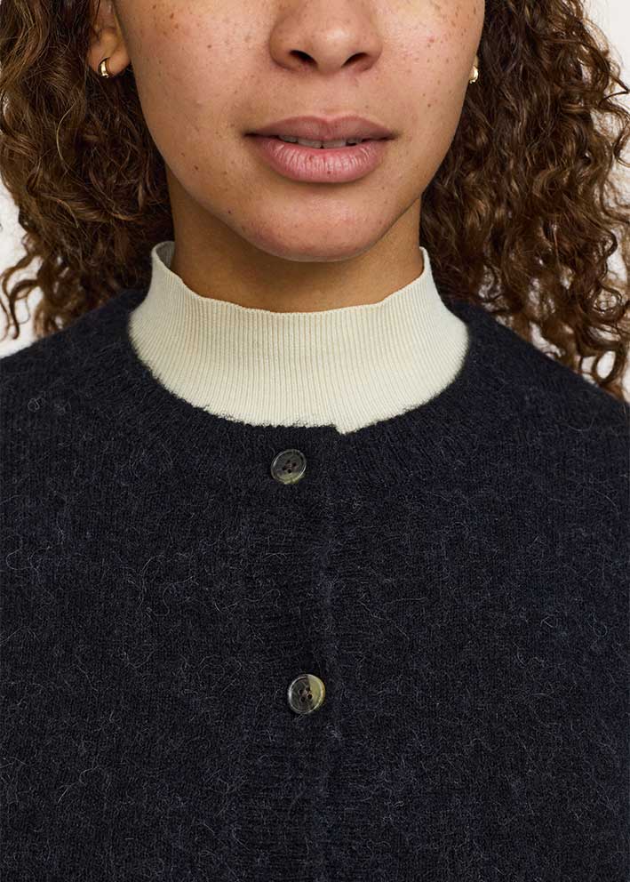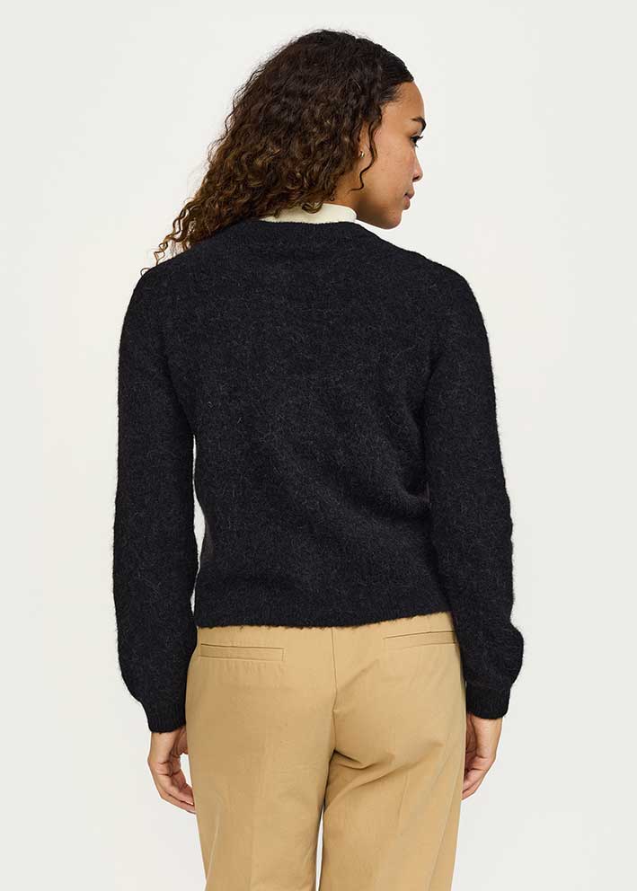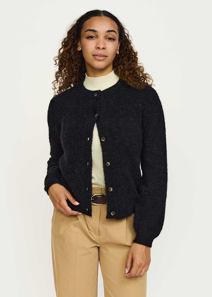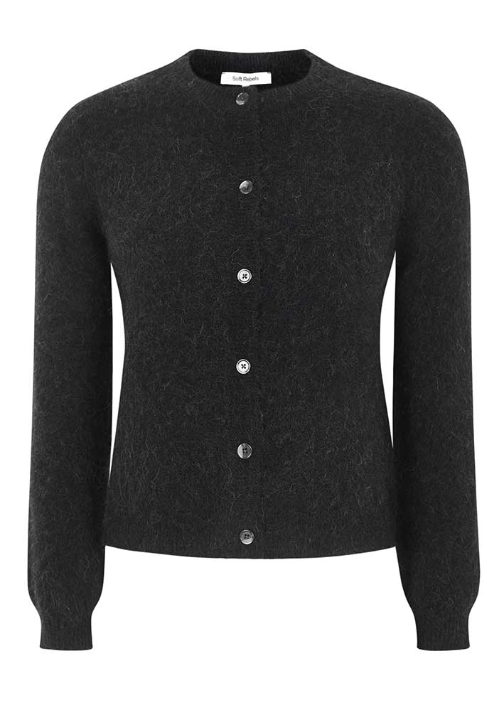 Skøn klassisk Allison cardigan fra Soft Rebels, strikket i en lækker blød kvalitet med uld og alpaca - her i en smuk sort-meleret farve.