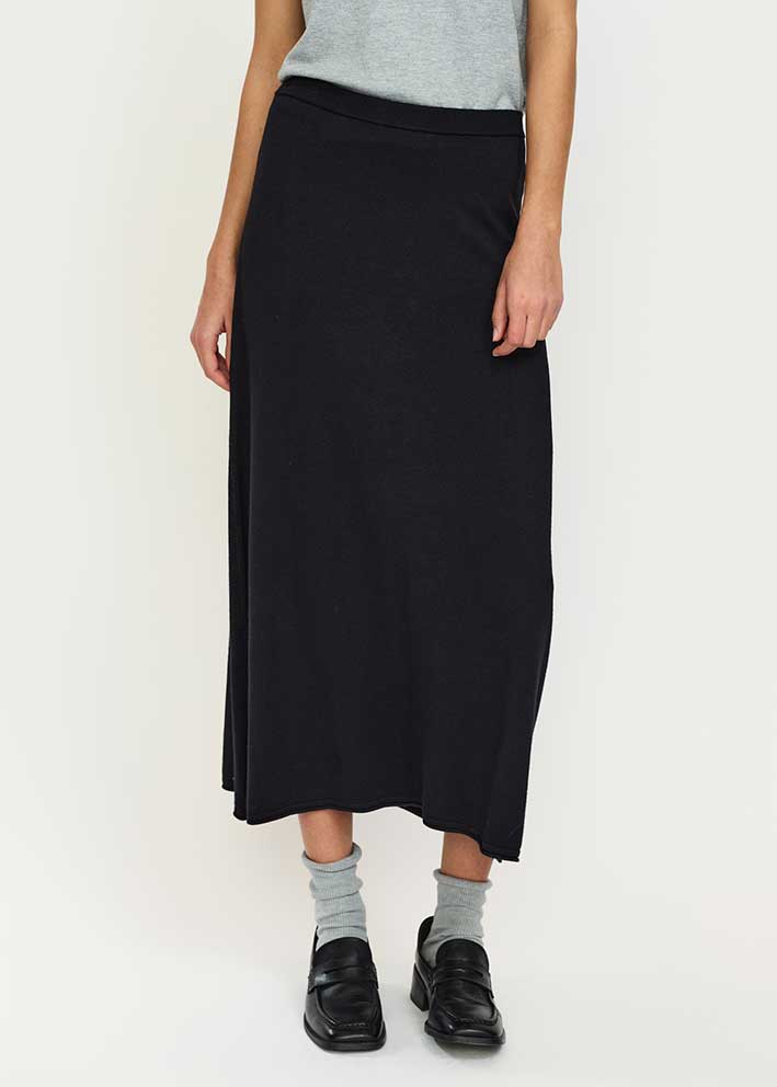 Skøn klassisk sort finstrikket Marla nederdel fra Soft Rebels, designet i et helt enkelt snit med elastik i taljen og længe til midt på underbenet.