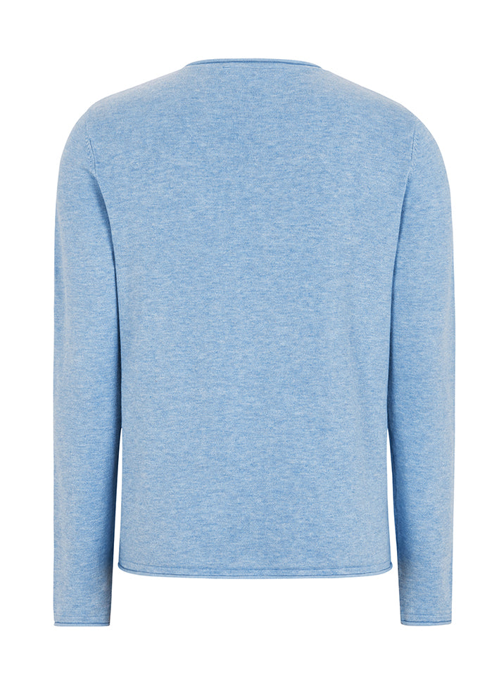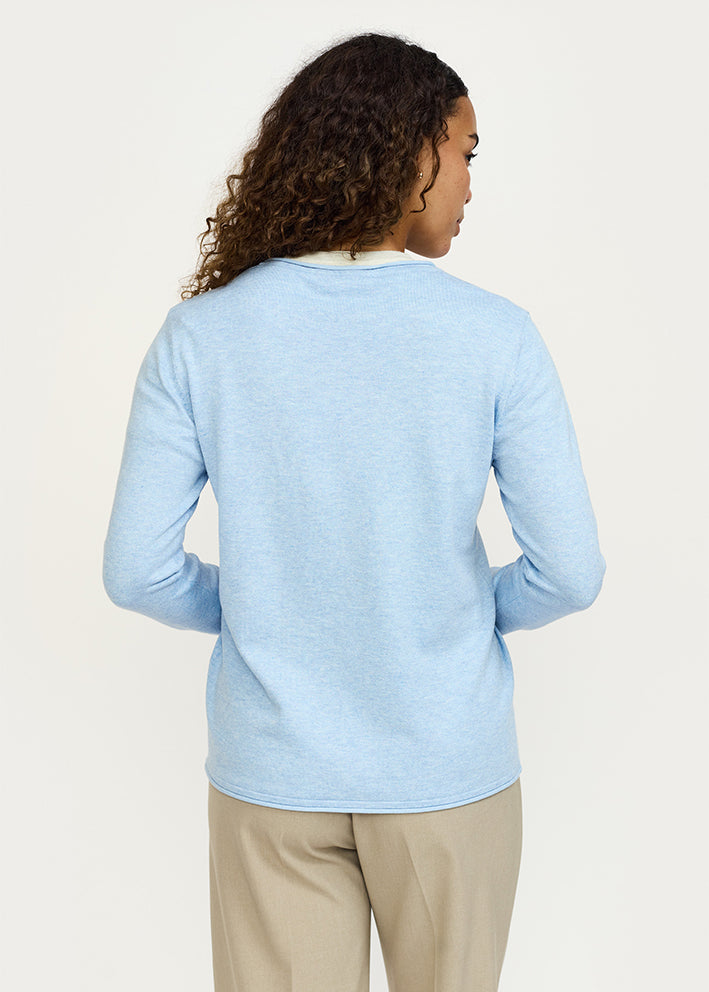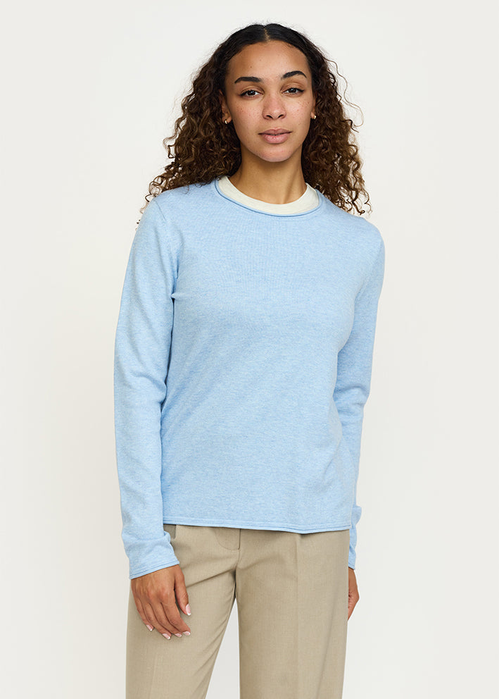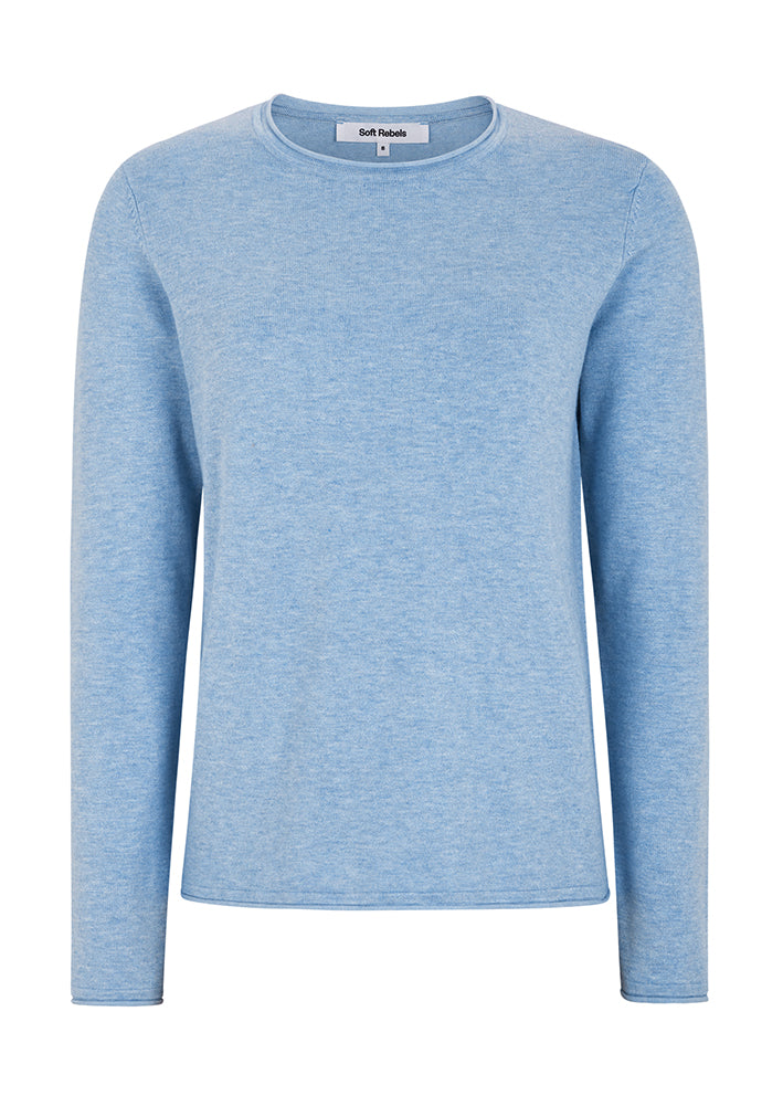 Skøn lyseblå-meleret Marla strik fra Soft Rebels, designet med lange ærmer, rund hals og rullekanter ved krave, ærmer og forneden.