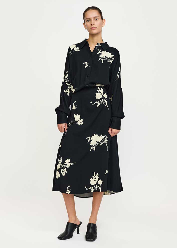 Melinda Midi kjolen fra Soft Rebels er en smuk og feminin kjole med et elegant Silent Flower Print - et diskret blomsterprint på sort bund, der giver kjolen et raffineret og tidløst udtryk. Kjolen er syet i blød, miljøvenlig viscose, der falder smukt og føles dejlig mod huden.