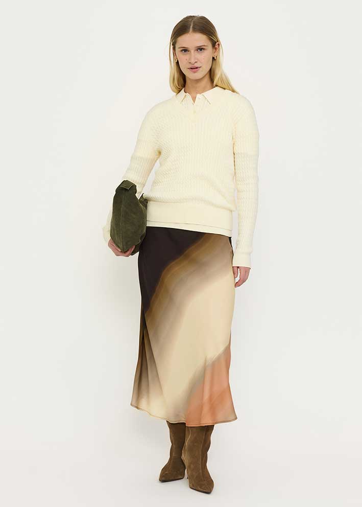 Soft Rebels Cassandra Midi Nederdel i det smukke Sunrise Print er en statement-nederdel der kombinerer bæredygtighed med nordisk design. Perfekt til at tilføje farve og personlighed til garderoben.